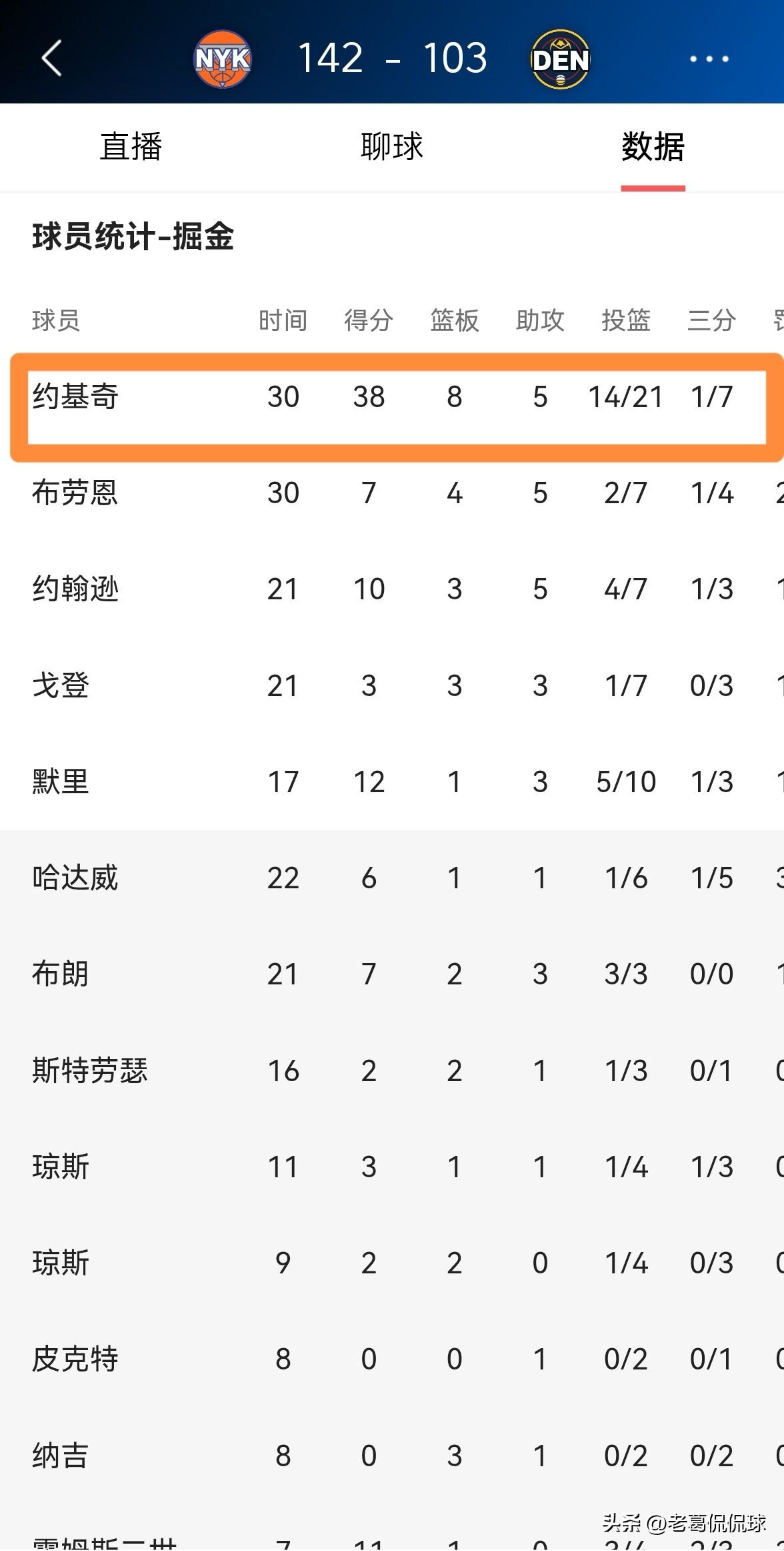 掘金超级球星约基奇终于老实了!在今天掘金主场以103:142惨败于尼克斯的比赛中,约基奇首发出战30分钟,投篮21中14,其中三分球7中1、罚球10中9空砍38分8篮板5助攻2抢断,还有3次失误,他的场上正负值为-18。 值得一提的是,在比赛结束以后,当转播镜头给到约基奇时,只见约基奇神情落寞的走向了球员通道,整个人看起来非常的老实。