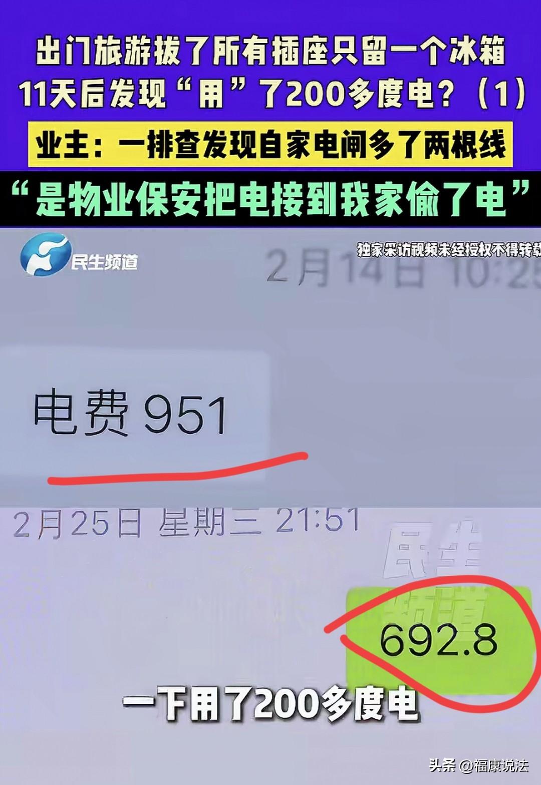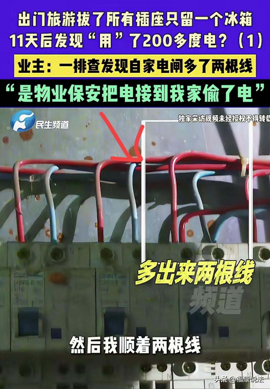 河南新乡,男子和妻子大年二十七去旅游,把家里所有插座拔掉,只留一冰箱,11天后回家发现,竟用了200多度电,找电工一排查,发现家里电闸多了2根电线,男子气的报警,发现是物业保安把电接到他家里偷电,男子找物业要说法,物业说:保安看闲置屋房门开着,见有电就住进去了,但不知道是谁接的电。双方协商结果令人无语。 大年二十七也就是2月24这天,朱先生夫妻俩准备出去旅游,临走时,他们把家里插座上的电源都拔下来,只留下一个冰箱用电。 而且,朱先生还去物业充了500块钱电费,当时,朱先生妻子记得电是951度。 2月25号,当朱先生和妻子在外旅游11天后,他们发现家里竟然一下用了200多度电。 一对比发现,2月14号朱先生出发当天是951度,到2月25号却发现是692.8度电。 朱先生两口子懵了,一个冰箱再用也用不了200多度电啊? 他们找到物业,对方安排了电工查看了朱先生家的电表,发现电表闪的非常快。 电工检查后说,朱先生家在使用大功率电器。 朱先生说,不可能,自己和妻子才起来,而三个孩子还在睡觉,家里没有使用大功率电器。 因为,朱先生家的电闸和地下室共用一个闸,于是,大家又去了地下室查看。 正常是每家每户都是两根电线,可到了朱先生家的电闸线路那里,却多出来两根电线。 顺着两根多出来的电线一排查,找到了一户人家,就是这家偷了走了朱先生家的电。 随后,大家又去找这户人家,一进门,朱先生就感觉到一股热气,用他的话说:“像澡堂子一样暖和。” 让他惊讶的是,这户人家没人住,可暖气片还开着,一个电锅,两个暖气片,用电量可想而知。 朱先生勃然大怒,气到报警。他说后来暖气片被民警拿走了。 而接下来,更让朱先生无法接受的是,他才知道物业有俩保安住进了这户人家,他认为是物业的保安在里面住,并且把电接到自己家里了。 朱先生带着记者找到物业要说法,他大声斥责,听说人偷物业电的,没听说过物业偷业主电的。 小区物业工作人员说,经理有事回郑州总公司了,并且认为,偷电的事是保安个人行为,反正朱先生报警了,就等着出结果该咋判就咋判。 当记者问工作人员要该保安电话时,让人不解的一幕出现了,工作人员说他没有保安电话,都在人事那。 他还说,保安大概在那住了将近三个月了,也是偶尔住,至于电是不是保安接的,他也不知道。 工作人员解释说,那个屋的门打开的,保安进去时就有电,所以,他铺了被子进去住了,但到底是谁接的电,工作人员表示不清楚。 不过,工作人员表示,物业从来没有提供住宿,换言之,这事是保安的个人行为。 朱先生的妻子听不下去,质问道,巧合的没有一点缺点。 工作人员说了一句话,直接给人气个倒仰,他说:全球所有的事情,都是巧合到一点才有故事的,不巧合都不会有事。 朱先生非常气愤的提出,住了两个保安,并且有暖气片,要说电不是保安装的,你说谁信呢? 据了解,电表箱平时也没有盖,也没有钥匙,盖一直开着,而且,物业工作人员表示一个月巡查一次,没有看里边。 第二天,物业工作人员表示已经和保安沟通,就按照一天一夜,它是1000瓦的,按三个月补偿朱先生家电费。 朱先生妻子表示,不同意,必须要严重加倍惩罚他们,要赔偿的话,就2万块钱。 不过,记者表示一年用电用不了两万块钱,费用确实有点多,赔偿的金额具体多少,也要在合理合法的范围内协商。 最后,朱先生表示,我们要的就是一个态度,不能把责任都推到保安身上,所以,到底是谁接的电,谁有偷盗这样行为?要追究这个偷电人的责任。 物业工作人员表示,会去落实,该辞退辞退,让保安把用的电费补交出来。 从法律上看,如果,能确定是保安私下接业主电线用电,那么,保安的行为已经属于盗窃电能的违法行为,要是偷电金额够大,还可能构成盗窃罪。 《电力法》第71条规定:盗窃电能的,由电力管理部门责令停止违法行为,追缴电费并处应交电费五倍以下的罚款;构成犯罪的,依照刑法有关规定追究刑事责任。 简单来说,偷电不单单只是把偷的电费补上,最高还要交5倍罚款,如果偷电金额达到当地盗窃罪立案标准(通常1000-3000元以上),或者多次偷电,就可能要坐牢。 另外,而物业也有一定的责任,一方面,电表箱长期没锁、每月巡查走形式,物业明显没尽到维护小区电力设施的管理责任。 另一方面,保安在空置房屋居住约三个月,物业不可能完全不知情,这种情况下把责任全推给保安,不符合法律上的“雇主责任”原则,物业要为员工的失职行为承担连带赔偿责任。 你对此怎么看呢?