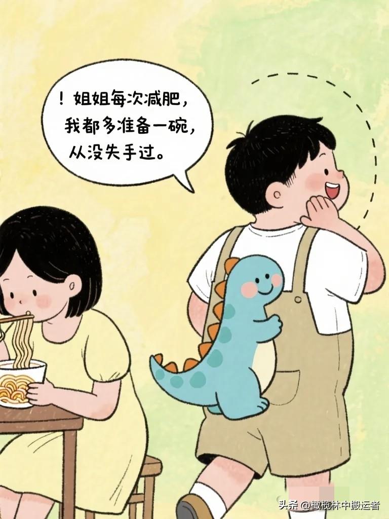 搞笑漫画:姐姐郑重其事地宣布:“从今天起,我要减肥,谁也别拦我!” 弟弟默默把薯片藏到身后:“好的姐,我支持你。”
