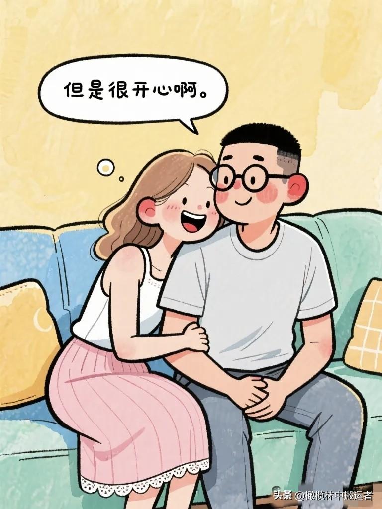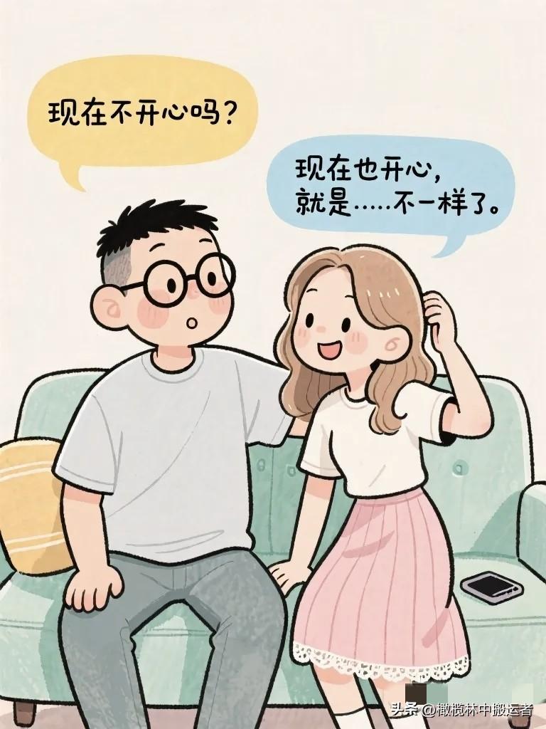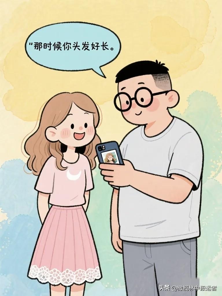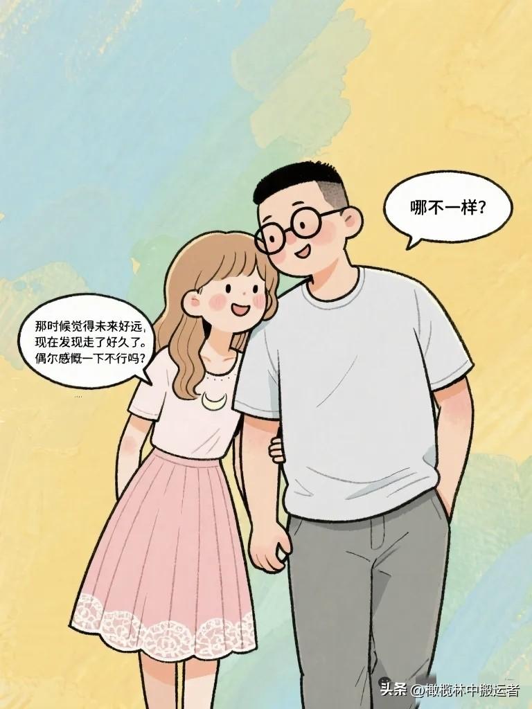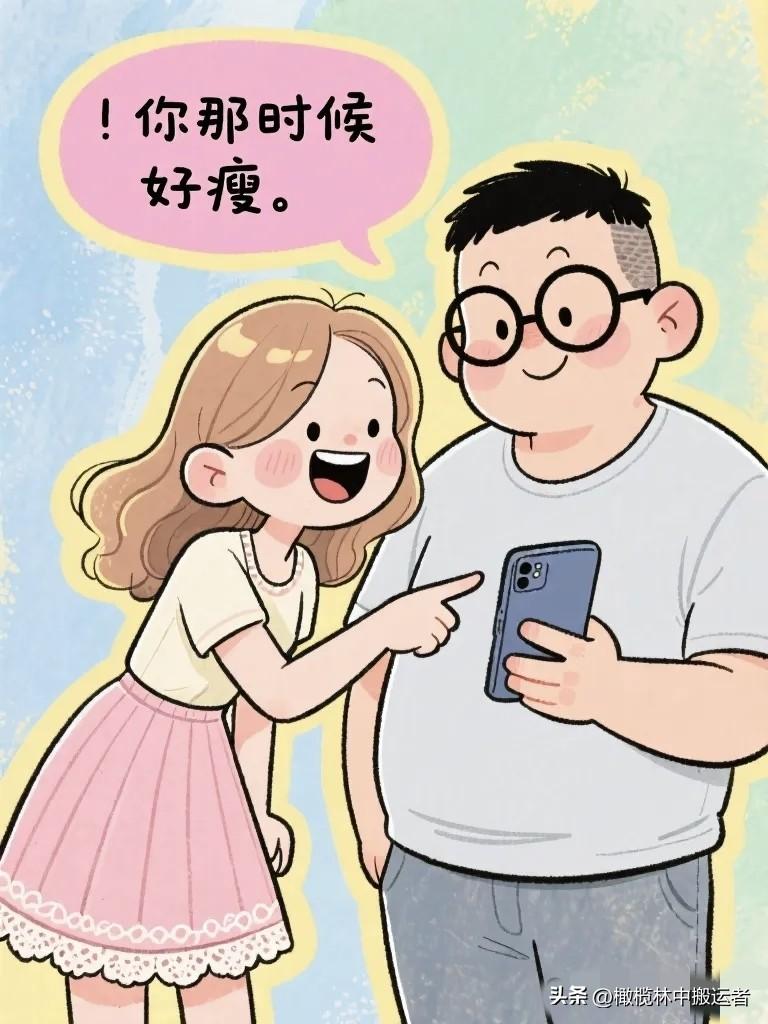 搞笑漫画:夫妻窝在沙发上看相册。 妻子:"你看,这是我们刚认识的时候。" 丈夫:"那时候你头发好长。" 妻子:"你那时候好瘦。"