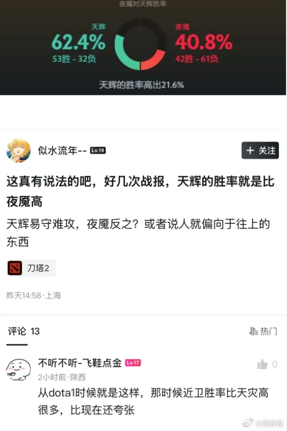 刀友说自己好几次战报天辉胜率比夜魇高,实话我也是这样,感觉天辉打得更加顺手一些,职业比赛也是天辉胜率高一些。dota2