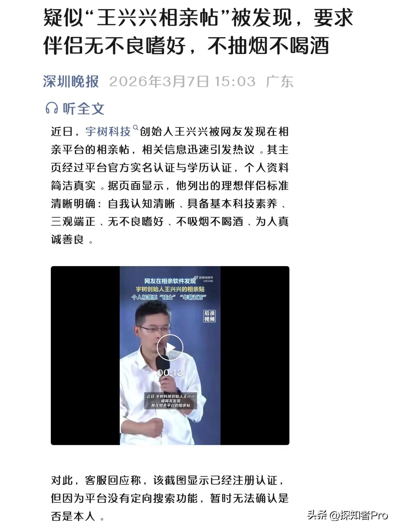 百亿富豪发帖征婚? 宇树创始人——王兴兴,居然有网友扒出他发帖征婚,太劲爆了。征婚要求:无不良嗜好、不吸烟不喝酒,自我认知清晰、具备基本科技素养、三观端正、为人真诚善良。 也不知道是真是假,如果是真的,以王总的魅力和钞能力,简直是征婚圈神一般的存在,那前来相亲的队伍不得排到海外去? 不过发现帖子的平台客服回应: 该截图显示已经注册认证,但因为平台没有定向搜索功能,暂时无法确认是否是本人。 不过,据查阅公开资料显示,王兴兴是有老婆的,他的老婆李舒然,还是宇树的骨干! 这大概率是某些网友的恶搞,或者为了流量的又一波操作吧?如果是,就真的无语了,可不能为了流量无下限,坚决抵制这种乱象! 不过是真是假,还是等王总本人的回应或者官方的正式通告吧。 吃瓜归吃瓜,千万不能造谣、信谣、传谣! (来源:中国新闻周刊、浙江经视、宁波晚报、后浪视频、百度、深圳晚报)