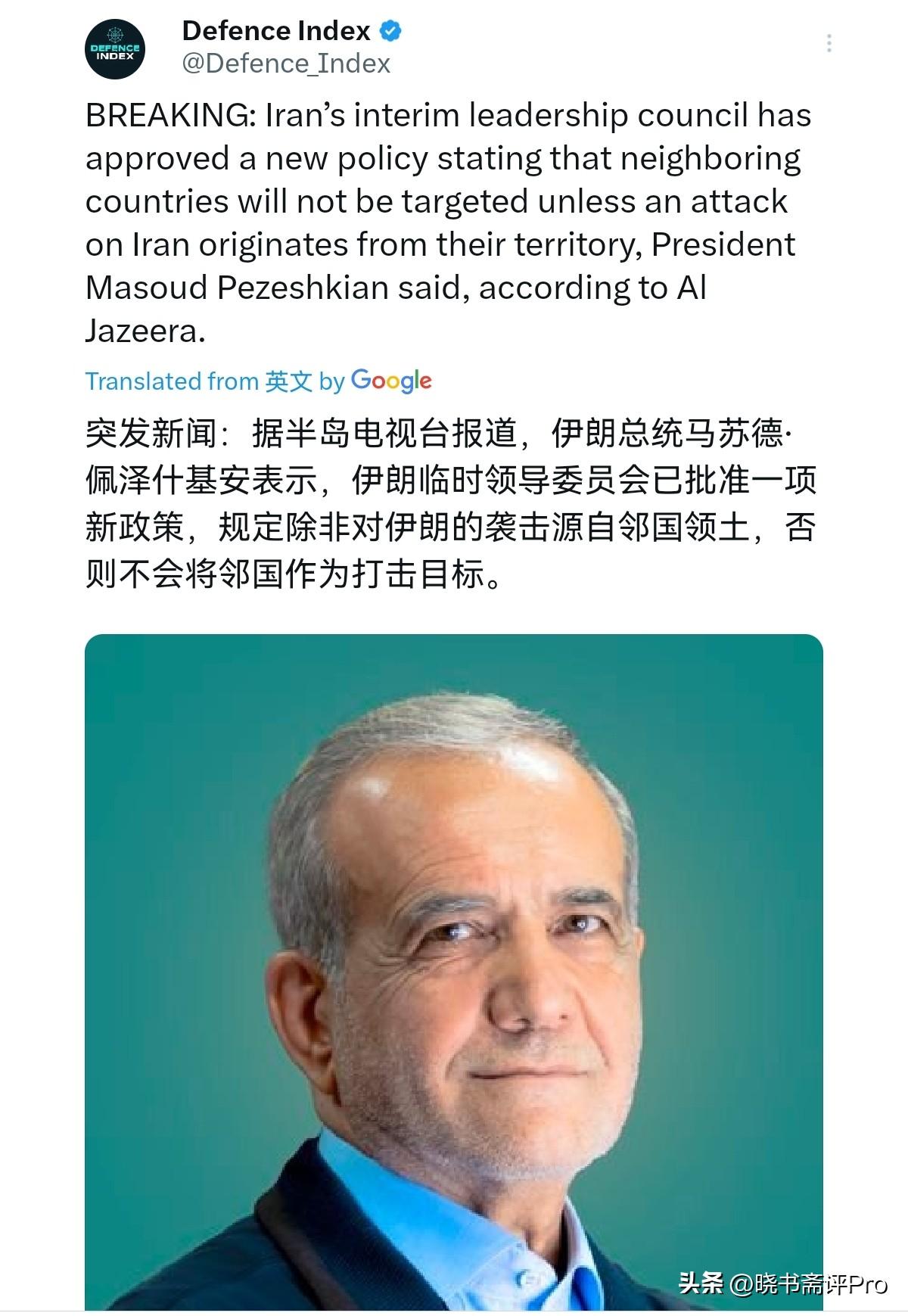 伊朗总统亮明底线!海湾国家必须二选一!3月7日,根据半岛电视台报道,伊朗总统马苏德·佩泽什基安表示,伊朗临时领导委员会批准了一项新政策,声明如果对伊朗的袭击并非来自邻国,否则不会成为袭击目标。伊朗也绝无侵略他国的意图。很显然,伊朗总统的这一表态,传递的是什么信息呢? 一句话,那就是那些有美军基地的国家现在只能进行二选一了。也就是,如果这些国家继续让美国使用其基地,对伊朗进行攻击,那伊朗一定会进行报复打击。而如果这些国家与美国划清界限,伊朗将会停止攻击。不得不说,伊朗的这一招很高明,很多中东国家不是抱怨伊朗的报复打击吗?现在伊朗可以说明确了底线。 事实上,伊朗的这一立场一点毛病都没有。如果这些国家让美国使用其基地打击伊朗,这些国家事实上就是美国的帮凶,伊朗当然有理由进行反击。很显然,伊朗现在给出选择,海湾国家这个时候就必须做出决断了。如果海湾国家仍站在美国那一边,那也只能为自己的选择买单,而再也没有理由能怪伊朗了。