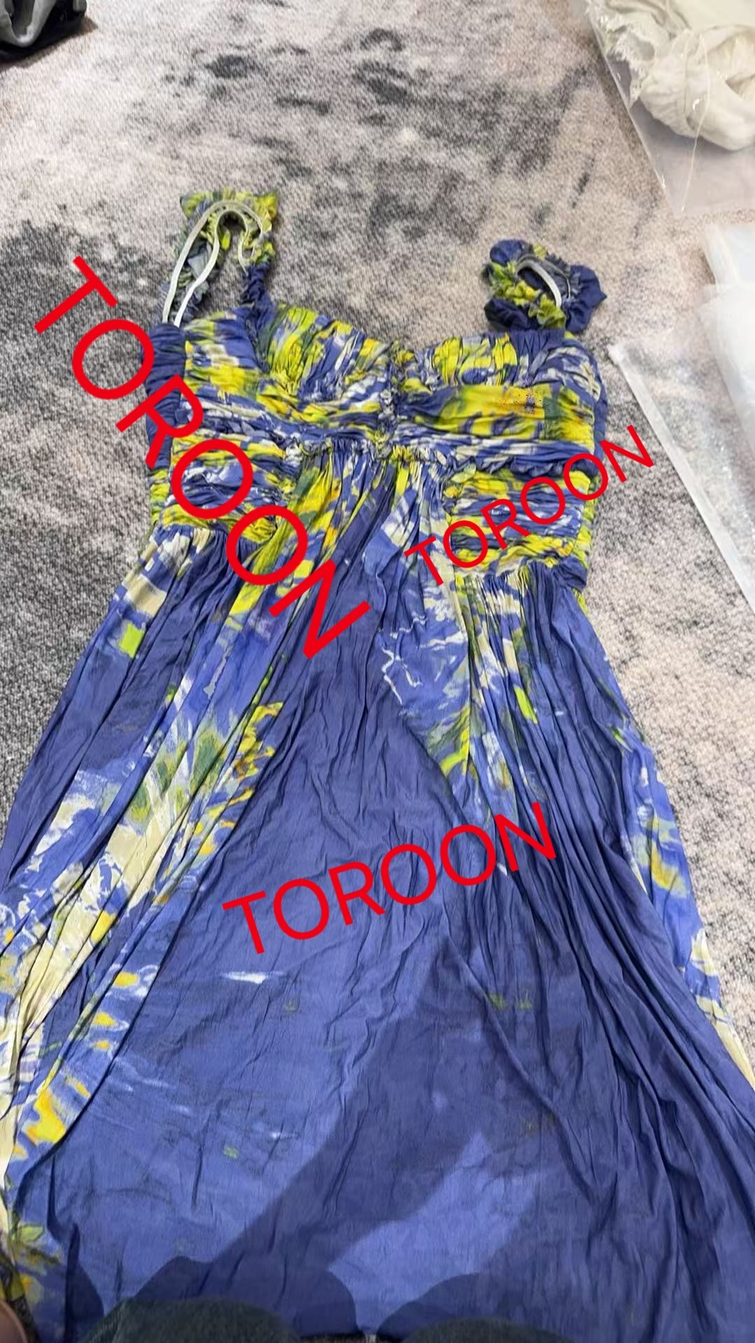 这个月底给大家上面料就得定一周这个裙子必须胸口是黄色多一点!然后裙子侧边一