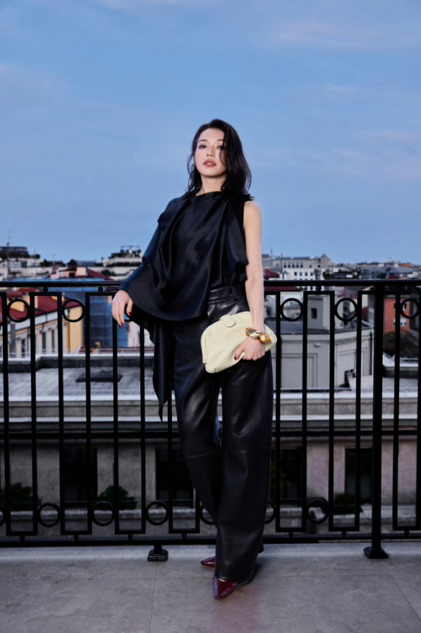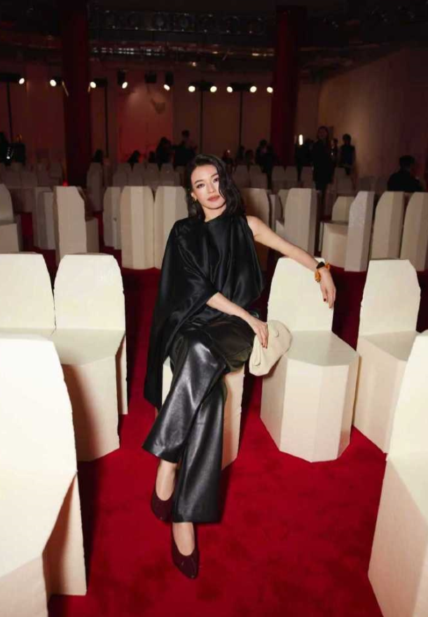 舒淇上身穿黑色绸缎风披肩,下身搭配黑色的皮裤,她特意把上衣塞进了裤子中,这样能够展现出更好的身材比例。