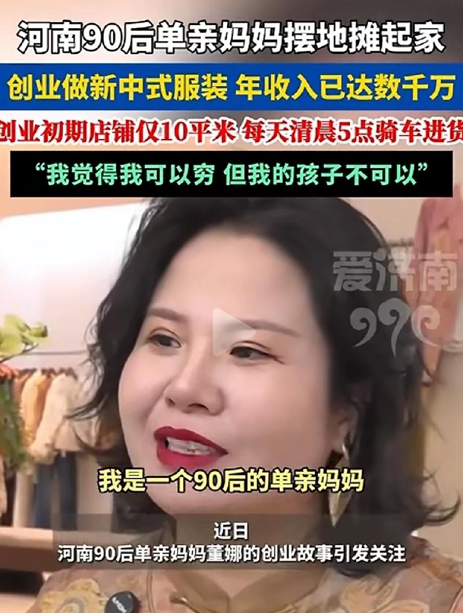 太燃了!河南,90后单亲妈妈董娜,700元摆地摊卖衣服起步,抓住新中式服装风口转型,如今拥有自有品牌、郑州千平店铺和全国20多家加盟商,2025年营收达数千万,还定下2026年营收1亿的目标。网友直呼太励志了! 2012年,董娜作为单亲妈妈,手里只有700元启动资金,想靠自己给生活拼个奔头。她先开了间10平米的小店,之后又去菜市场摆摊,日子过得特别拼——每天清晨5点就骑车去进货,忙到深夜才休息,一天只能睡3-4小时,就这么一点点攒客源、攒经验。 到了2018年,她发现大家越来越喜欢有传统味道又好看的新中式服装,这可是个好机会! 她果断把之前攒的全部积蓄都投进去,专门做融合传统韵味和时尚设计的新中式衣服,还优化了供货和设计环节,让衣服又好看又好卖。 而且这几年新中式服装特别火,2024年整个市场规模就超2200亿元,2025年还在继续涨。董娜选对了赛道,生意越做越大:现在在郑州有上千平米的零售店和批发档口,全国还有20多家加盟商,2025年卖货的总营收就有几千万,真正从摆地摊的妈妈变成了品牌老板。 有网友说“单亲妈妈太难了,每天只睡3小时,这份坚持谁能比?”, 为网友说“选对赛道+踏实努力,这才是普通人逆袭的正确打开方式”。 还有网友理性表示“营收不是净利润,得客观看待,别过度神话”。 在我看来作为单亲妈妈,她没抱怨生活的难,反而凭着一股不服输的拼劲,从700元的起点熬过来。 每天睡3-4小时的日子,换谁都难坚持,可她扛下来了;敢把全部积蓄投进新中式赛道,这份眼光和勇气也不是谁都有。 网友说的理性看待很有道理,但这一点都不影响她的厉害——普通人想逆袭,缺的就是这份“敢拼+会选”的劲头! 生活从不会辜负拼命努力的人,起点低没关系,选对方向+踏实坚持,就能改写命运。 她不仅靠自己活出了精彩,还让我们看到,单亲妈妈也能顶起一片天,普通人也能通过奋斗实现梦想。 希望董娜2026年营收1亿的目标能顺利实现,也愿每个为生活打拼的人,都能像她一样,找准方向、咬牙坚持,最终收获属于自己的成功!