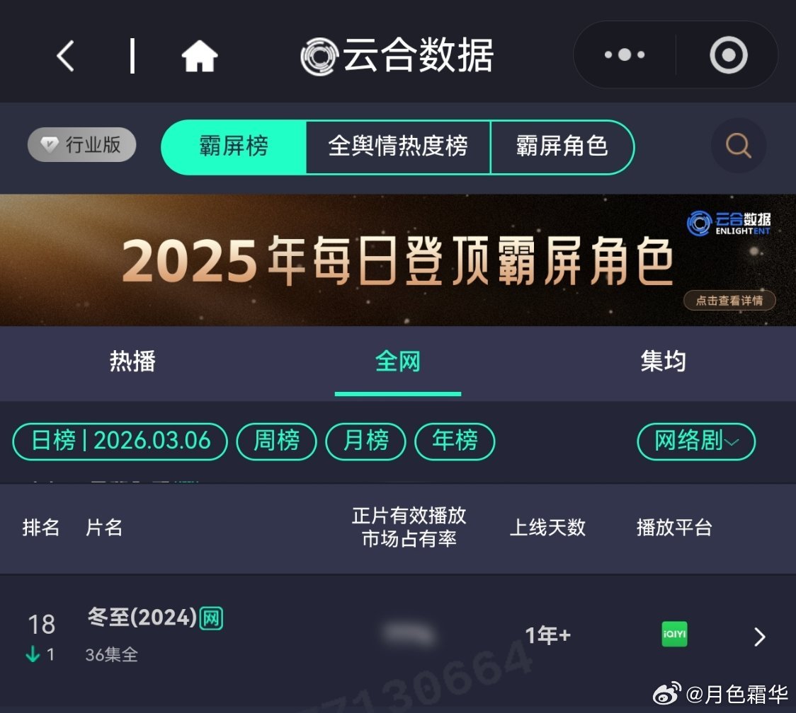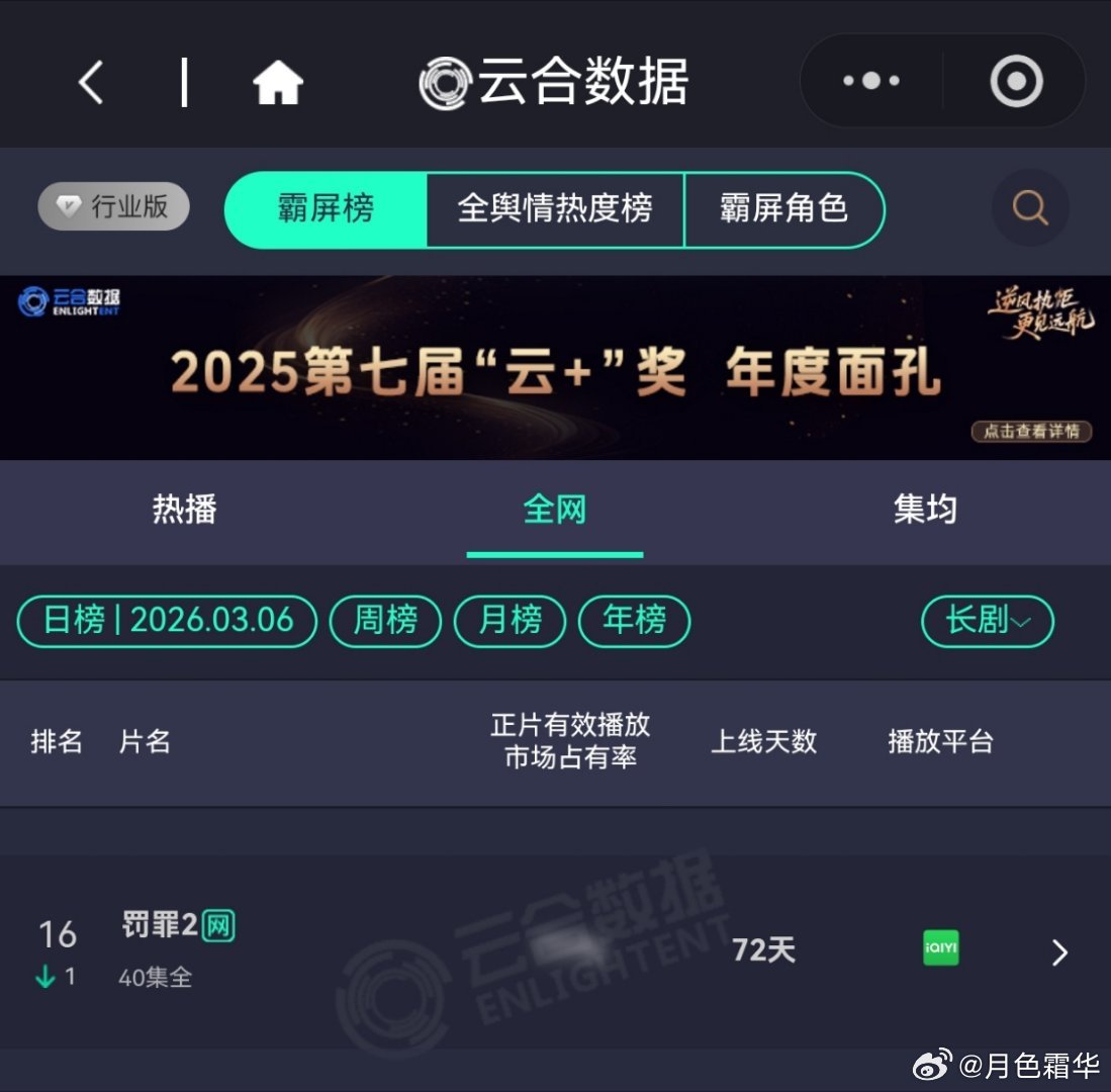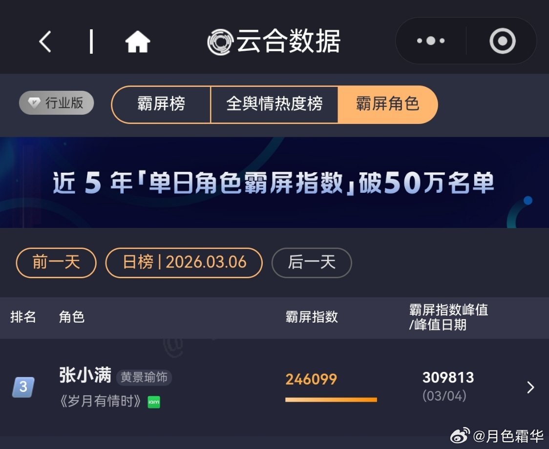 3月6日,黄景瑜岁月有情时 开播第15天,云合第3,霸屏榜黄景瑜张小满 第3,酷云全端第3。黄景瑜罚罪2 云合热播期结束第20天,上线第72天,全网第16。黄景瑜秦枫 ,冬至,网络剧榜第18,罚罪第22。 都不想看这个了,太多的比赛在办公室里就决定了,你再怎么认真努力,人家调调数据就行了。
