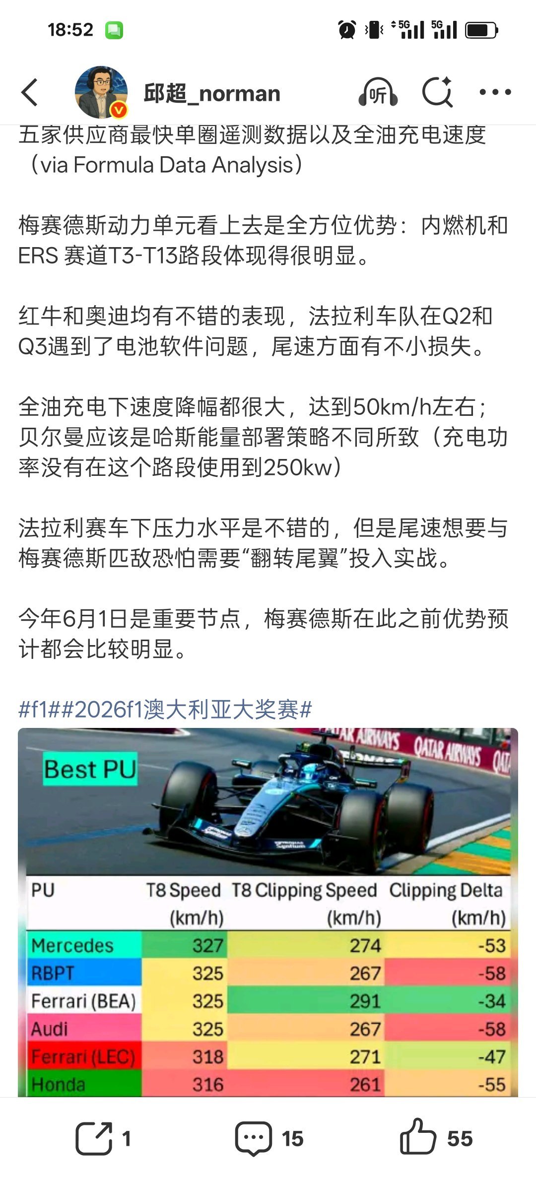奔驰还是厉害,两次规则大改都是遥遥领先,汽车发明者的含金量再次提升。奥迪也不错,0经验居然可以排中上游……相比而言,马丁➕本田的组合实在是不想吐槽了,还是当奔驰粉让人自信,当本田粉时不时就抬不起头啊,竞猜一下,明天马丁本田能撑几圈退赛。话说咱牢大速度垫底还积极直播,这不得不说是一种文化自信。