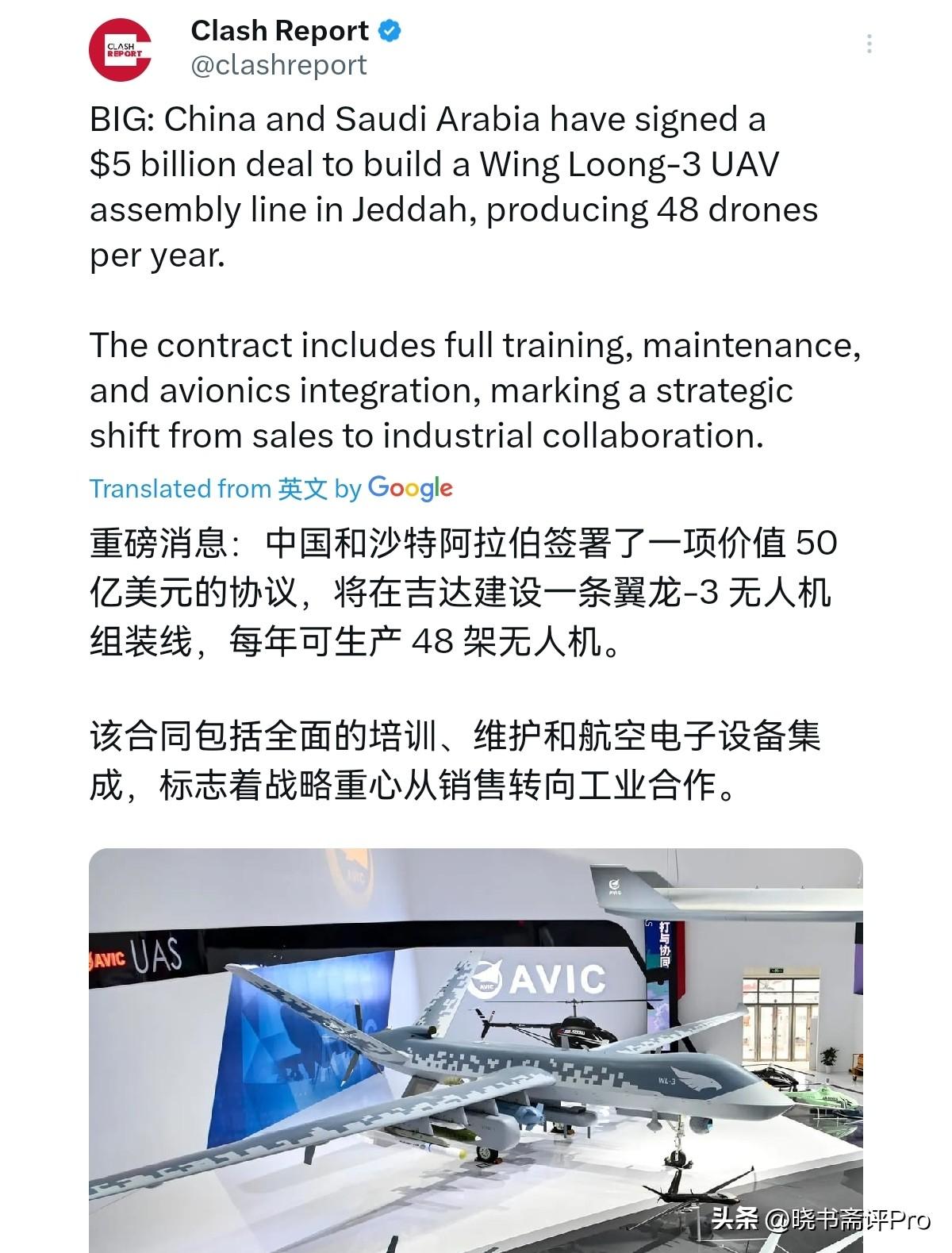 沙特被打醒了!沙特紧急与中国敲定了军工订单!3月7日,根据外媒报道,外媒称,中国和沙特阿拉伯签署了一项价值50亿美元的协议,该协议的核心是中国将在吉达建造一条翼龙-3无人机装配线,每年生产48架无人机。该合同包括完整的培训、维护和航空电子设备集成等等。 很显然,现在中东战火纷飞,沙特选择在这个时候紧急与我们敲定军工合同,这说明什么呢?这说明沙特对提升自身军事能力有极强的迫切性。当然,这个合同最特殊之处就是我们将向沙特转移军事技术。显然,在长期买买买之后,现在沙特的思路明显是变了,沙特将更加追求国防工业的独立自主。 为什么沙特看中我们的军事装备呢?这主要有两方面的原因,其一是,我们的国产无人装备性能先进,越来越值得信赖。其二是,美国长期只卖整机、不转让技术、并且附加政治条件,这让沙特感到诸多限制。采购中国装备有助于沙特国防工业自主,改变对美国依赖的局面,而这也可以进一步提升沙特外交与军事的自主性。
