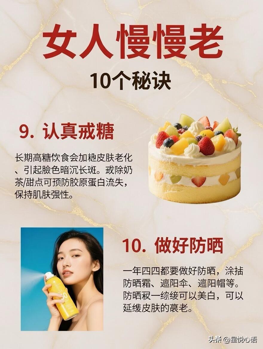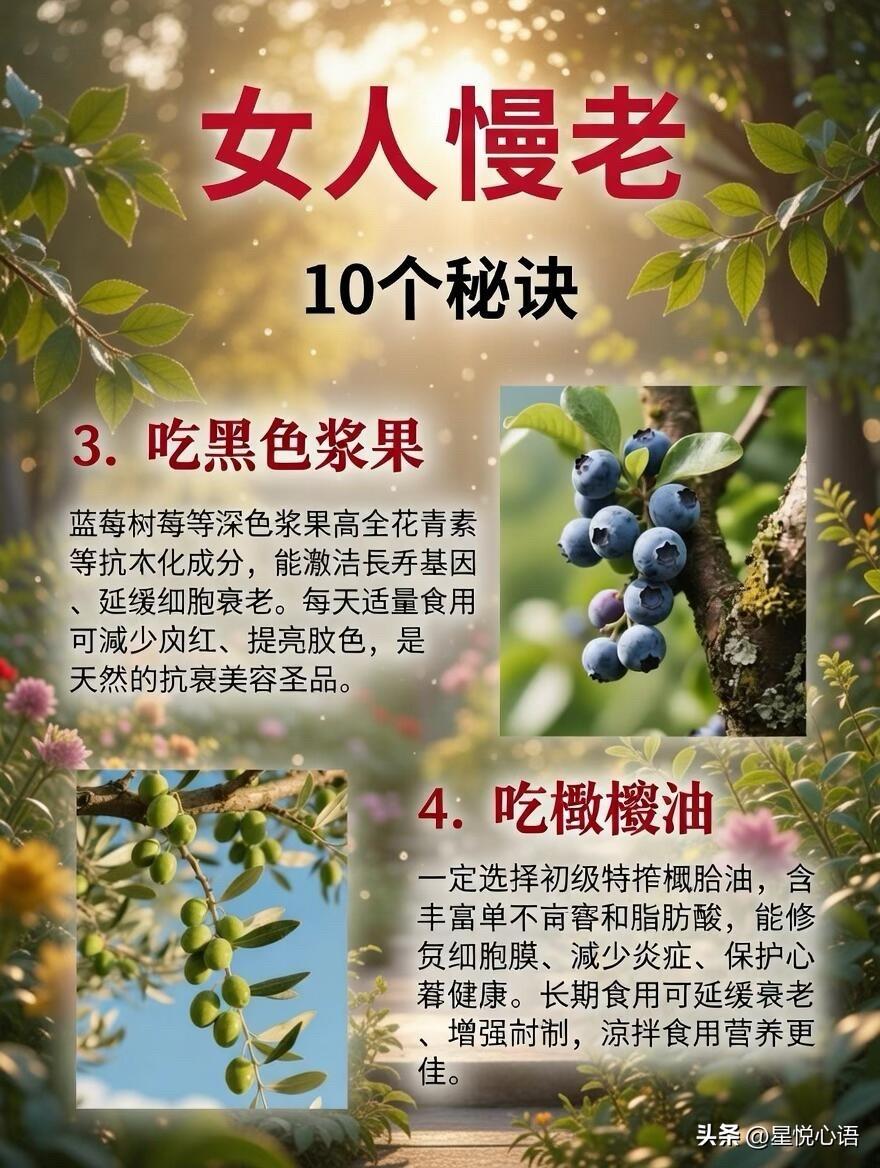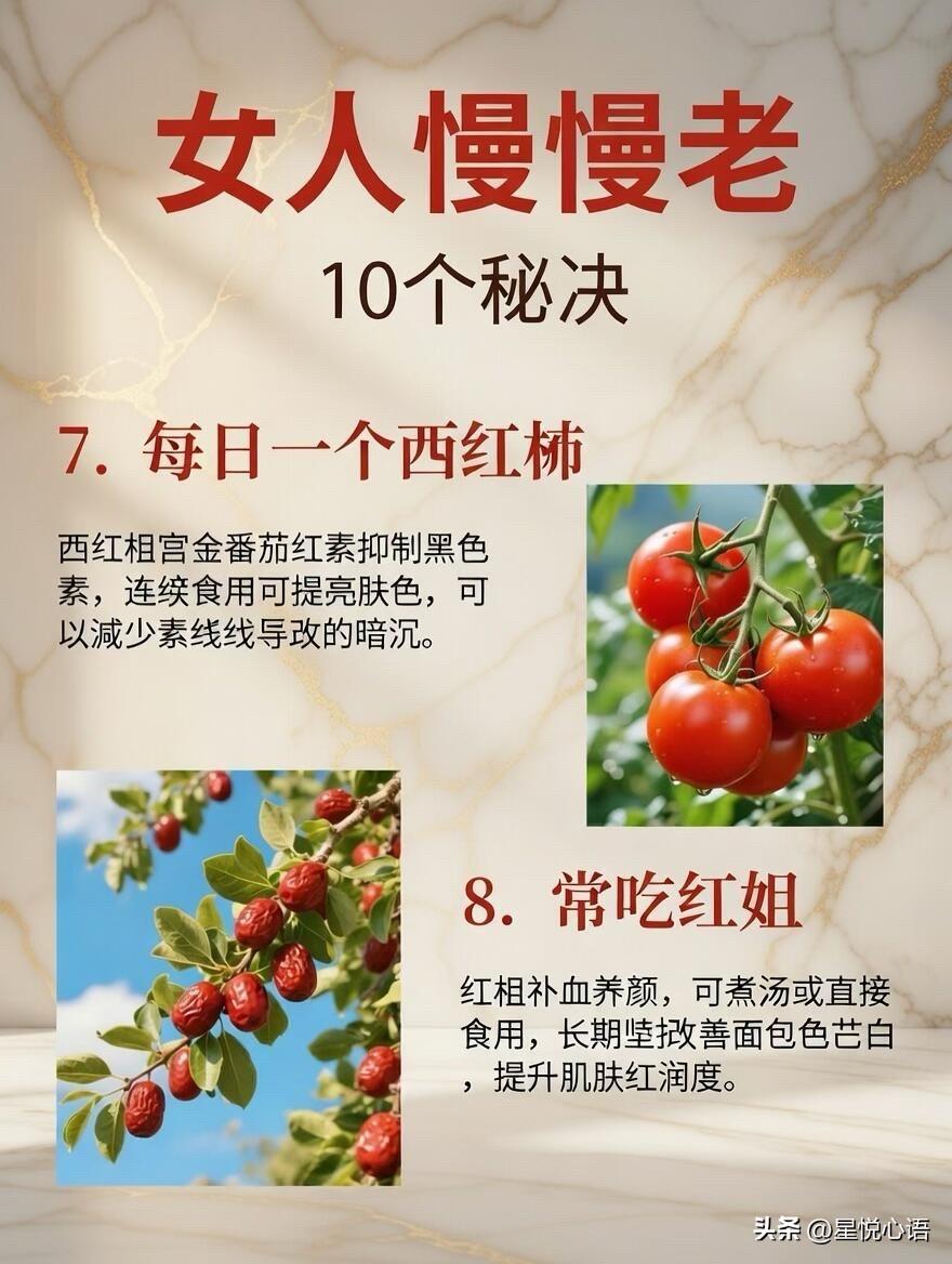 分享女生慢老的10个秘诀 抗老真的不用砸大钱买贵妇品 日常吃对做对,小习惯就能悄悄慢老 睡前喝无糖酸奶,调肠道菌群 补B族维生素,提睡眠还抗氧化 每天一勺黑芝麻,养肝肾润发质 稳皮肤屏障,换季泛红都变少。 晨起喝自制无糖豆浆,补大豆异黄酮 每天一个西红柿,番茄红素提亮肤色 蓝莓树莓常吃,花青素帮着抗衰 初级橄榄油凉拌吃,护血管修细胞膜。 红枣煮汤吃,补气血养出红润感 晚上泡泡脚,促循环解疲惫助深眠 认真戒糖,守住皮肤的胶原蛋白 全年做好防晒,美白又延缓皮肤老化。 这些都是家常小事,不用刻意硬撑 把养生融进日常,慢慢就会发现 皮肤不垮,气色在线,素颜也能被人夸 女生的慢老,从来都是藏在日常的坚持里。