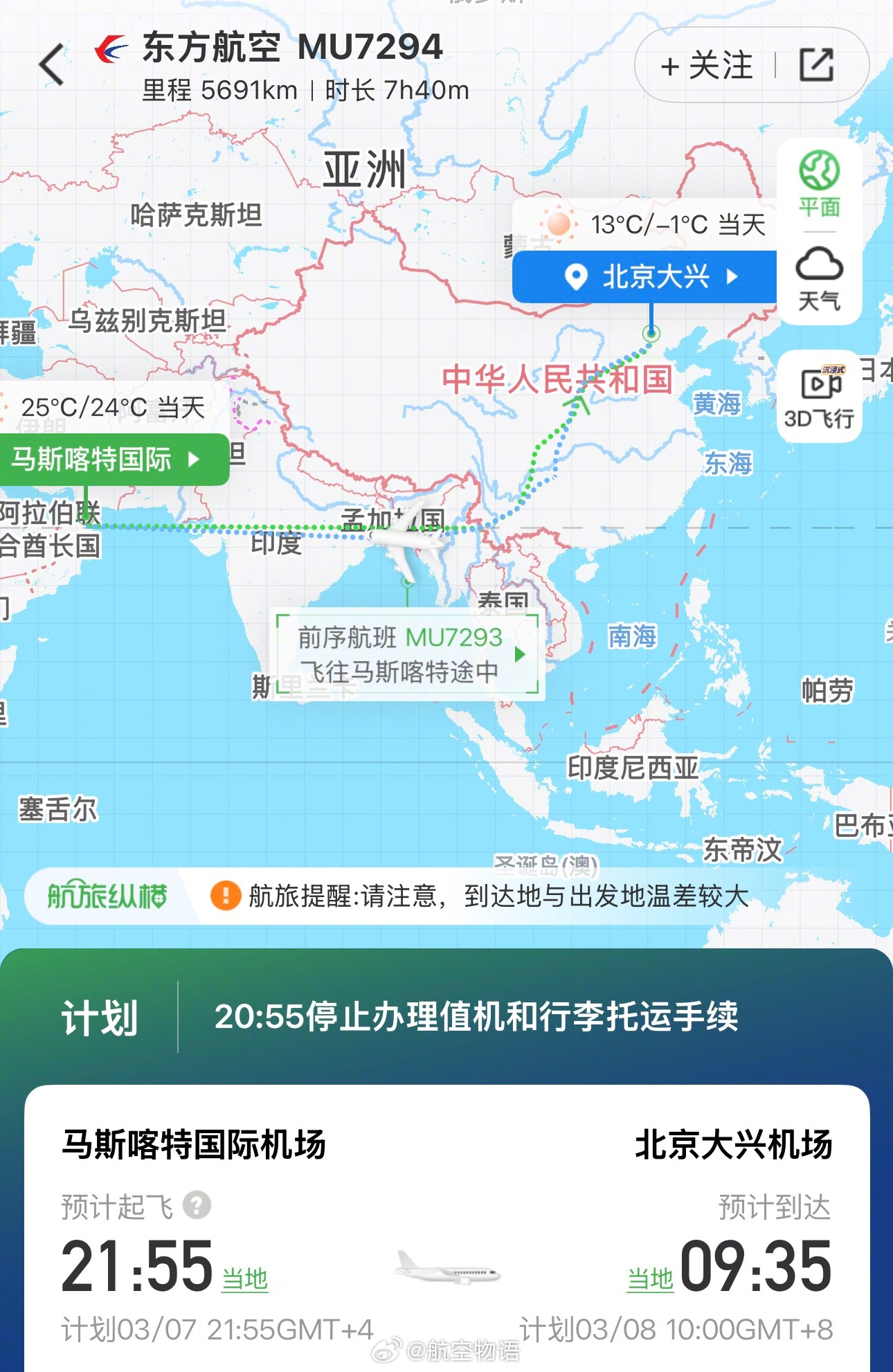 经全力做工作,中国东方航空公司已安排一班阿曼首都马斯喀特至北京航班(MU7294),计划于阿曼当地时间3月7日21:55起飞回国,目前仍有余票。