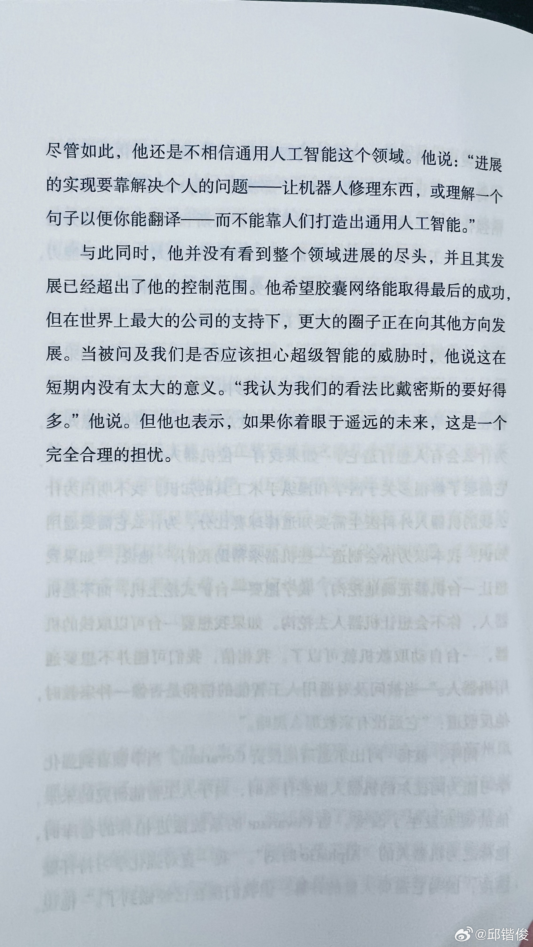 差点错过一本好书——毕竟书非借不能读也,更何况别人送的书呢。应该是来自地平线的赠书,地平线创始人余凯为这本书作序,并且在本书种有不少笔墨涉及。按本书所讲,余凯博士堪称中国Ai的燃灯者、传灯人。说几个推荐理由吧:美国记者写的书,多半都很好读,哪怕是产业、科技记者,他们的报道(story)本来就是讲故事的,不像我们的软文,喜欢长篇大论和深化拔高;对Ai的历史,尤其是深度学习(深度神经网络)的历史和应用能有非常深入的认识——如果你和我一样关注自动驾驶和智能座舱、智能助理这些,就会发现,其实自动驾驶领域的很多新突破,仅仅是刚刚追上或者应用了DeepMind的很多理念;它就像另一本《硅谷之火》,比如说,辛顿三个人的公司卖了4400万美金,50人的DeepMind卖了6.5亿美元,而其中个人英雄打败巨头的故事层出不穷;这本书收笔于2020年左右,虽然没有覆盖chatgpt时刻,但不少当今大牛都已经登场,并且其中很多主人公还在一线;辛顿是大男主之一,颇具个人魅力,他由于疾病不能坐下,却类似于“持六国相印”被多家巨头请教,如今也桃李天下,并且持续在传播Ai;辛顿贡献了本书很多的梗和妙语。与他同获图灵奖的杨立昆和本吉奥也有不少笔墨涉及。本吉奥有一句判断很有意思:机器人需要睡觉,因为它也需要做梦……总之吧,推荐大家一读。好书推荐地平线