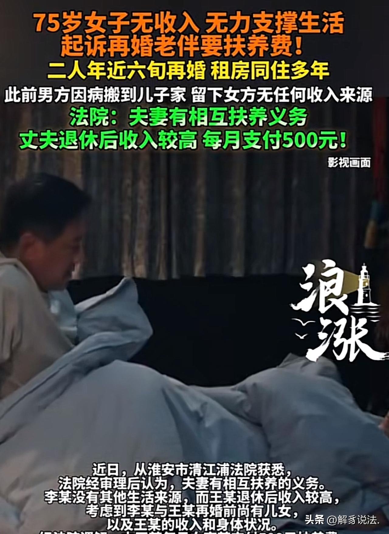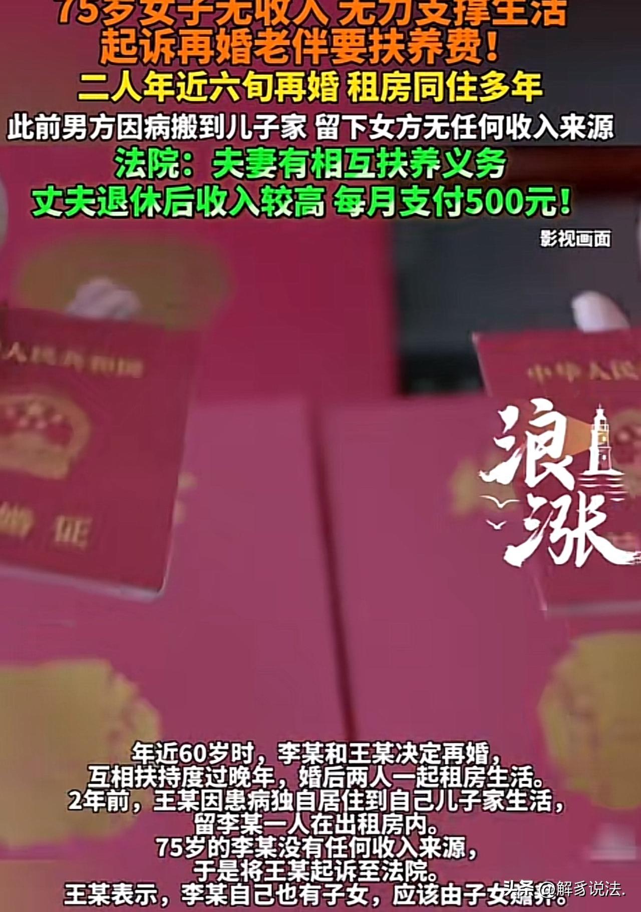 “半路夫妻靠不住!”江苏淮安,60男子与女子二婚后,生活在出租屋里。谁知,2年前,男子突然患病,随后,独自搬到儿子家生活,留女子一人在出租房内。彼时,75岁女子没有任何收入来源,无法生活下去,于是,一纸诉状将男子起诉到法院,要求男子支付抚养费。男子委屈不已,认为女子有儿有女,凭什么找自己要抚养费?法院的调解结果很意外! 李某和王某都是苦了大半辈子的人,各自经历过生活的坎坷,到了年近60岁的年纪,身边没个贴心人陪伴,日子过得冷清又孤单。 两人经熟人介绍相识,相处下来觉得彼此脾气相投、为人实在,没有太多花哨的想法,就想着老了能有个伴,平日里互相搭把手、说说话,生病时有人端茶送水,天冷了有人添衣问暖,踏踏实实过完剩下的日子。 没有隆重的仪式,也没有丰厚的彩礼嫁妆,两位老人简单地领了结婚证,下定决心再婚,往后余生相互扶持,安稳度过晚年。 婚后,两人没有置办新房,就在外面租了一间普通的房子过日子。 日子过得朴素又平淡,柴米油盐都是精打细算,平日里一起买菜做饭、收拾屋子,傍晚出门散散步、聊聊天,遇到烦心事互相开导,身体不舒服时彼此照料。 出租屋不大,却因为两个人的相伴,多了不少烟火气,对于两位独居多年的老人来说,这就是最踏实的幸福。 他们没有太高的追求,只盼着身体健健康康,就这样互相陪着走到最后,平淡的相守,就是晚年最好的慰藉。 安稳的日子过了数年,变故却悄然来临。 两年前,王某的身体渐渐出了问题,患上了疾病,浑身难受不说,生活也渐渐难以自理,自己照顾自己都成了难事。 王某想着,自己生病后无力照料老伴,反而还需要人贴身照顾,出租屋里条件简陋,没人专门看护实在不行,思来想去,便决定搬到自己儿子家去居住,让儿子在身边照料自己的饮食起居和看病事宜。 就这样,王某收拾了简单的衣物,独自搬去了儿子家,留下75岁的李某一个人守在出租屋里。 李某已是75岁高龄,年纪大了,完全丧失了劳动能力,一辈子操劳也没有攒下积蓄,既没有退休工资,也没有其他任何收入来源。 王某搬走后,李某独自一人生活,没有经济收入,连最基本的吃饭、穿衣、水电开支都成了难题,日子过得举步维艰。 她无依无靠,实在没有办法维持生活,无奈之下,只能将王某起诉到法院,希望老伴能尽到夫妻间的扶养义务,给自己一点生活费用。 面对李某的诉求,王某觉得十分委屈,他认为李某再婚前就有自己的子女,按照常理,老人晚年就该由亲生子女赡养,自己生了病,自身难保,还要花钱治病,根本没有能力再承担李某的生活开销,坚持认为李某的赡养责任该由她的子女来承担。 此事曝光后,网友给出了自己的看法: 既然在婚姻存续期间,总不能不抚养吧,而且婚后的收入本来就是夫妻双方共同财产,工资应该给点吧! 夫妻不是应该共同生活吗?是谁主动提出分开的?如男方提出,而且有养老金,则必需负责对方养老。如女方主动提出,放弃相互扶持的义务,则没必要再负责。 《民法典》第1059条规定:夫妻有相互扶养的义务。需要扶养的一方,在另一方不履行扶养义务时,有要求其给付扶养费的权利。 李某年事已高、无劳动能力亦无其他生活来源,属于需要扶养的一方;王某退休后收入较高,具备相应抚养能力。 法院综合考量李某再婚前尚有子女、王某的收入水平与身体状况等实际情况,组织双方调解,最终达成一致,由王某每月向李某支付500元抚养费。 欢迎关注@解豸说法.