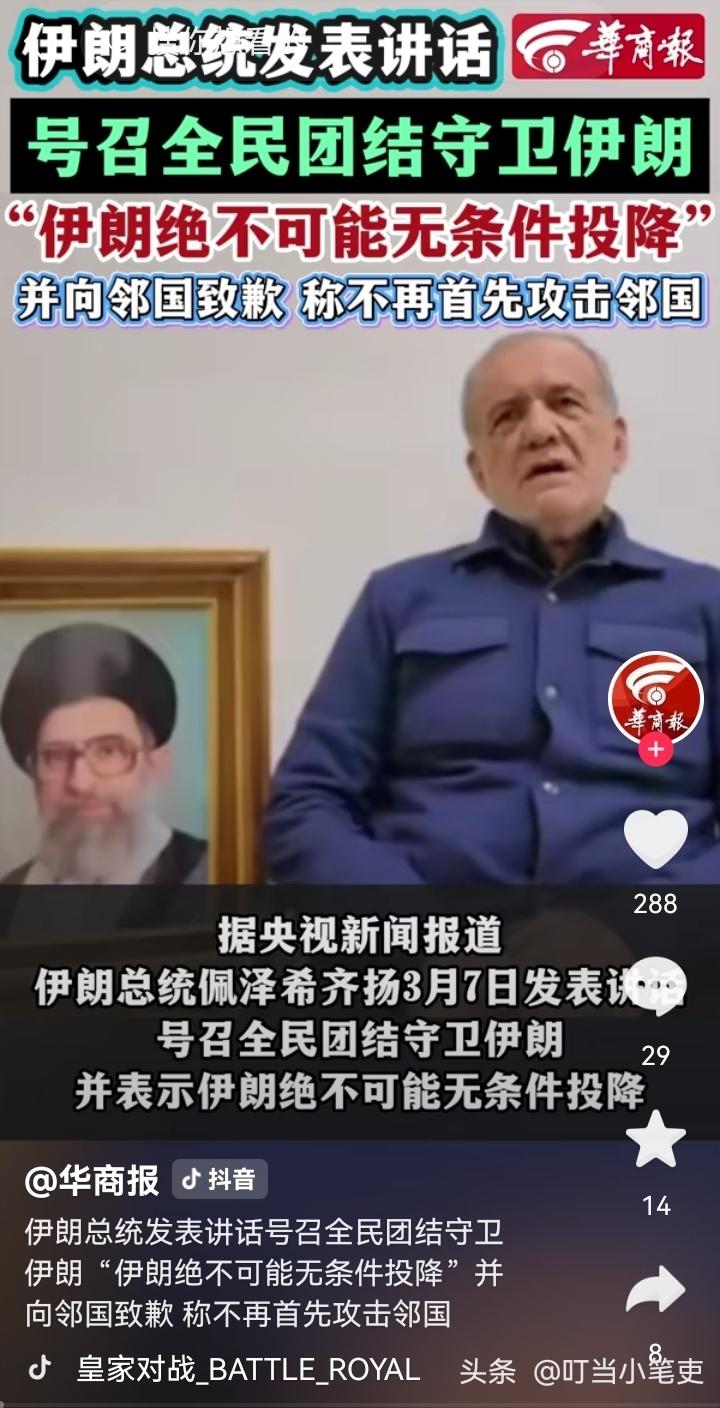 “伊朗绝不可能无条件投降”,伊朗总统佩泽希齐扬3月7日在伊朗电视台表示。 佩泽希齐扬还就伊朗前几天向邻国发起攻击一事,而向他们致歉,并承诺不再主动针对邻国采取军事行动。 伊朗总统的态度还是挺诚恳的,策略也是对的,在国家面临生死存亡的紧要关头,能不树敌就尽量不树敌,让朋友多点,总比让敌人多点要好。 不过,佩泽希齐扬的表态只是表面,关键还得看他的命令能否执行到位,如果能贯彻落实,说明他把控了全局;如果是阳奉阴违,说明革命卫队有自己想法,拒绝服从他的命令。