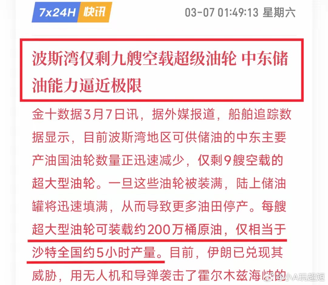 完犊子!懂王继续火上浇油:正在考虑扩大打击范围,包括此前未被列为目标的地区和人群。战争有扩大化、复杂化、长期化的趋势。另外一边,中东国家可能很快就会开始大规模减产,因为储油能力正在逼近极限!目前波斯湾可用的空载油轮,只剩下9艘,每艘能装200万桶石油,仅相当于沙特5小时的产量。虽然沙特有东西输油管线,但只能解决不到一半的产量,如果三天后,霍尔木兹海峡还不开放,光沙特一家,就得被迫减产40%以上。别忘了,那地方还有卡塔尔、阿联酋、科威特、伊拉克,全是产油大户,它们的油同样出不来,一样得减产。你当卡塔尔能源大臣喊150美元油价,是在画k线呢?现在1000美元都没用,因为油根本就出不来。要知道,海湾国家主权基金,可是美国AI公司最大的金主,也是美股最重要的投资者。如果中东王爷们被迫减产,没钱花了,你觉得他们会怎么办?美股瑟瑟发抖~就这,懂王还要派第三艘航母去中东,还打算派地面部队进入伊朗,再加上美国那完蛋的非农数据和失业率,滞胀就在眼前。你说这事怎么弄啊?全完无解。