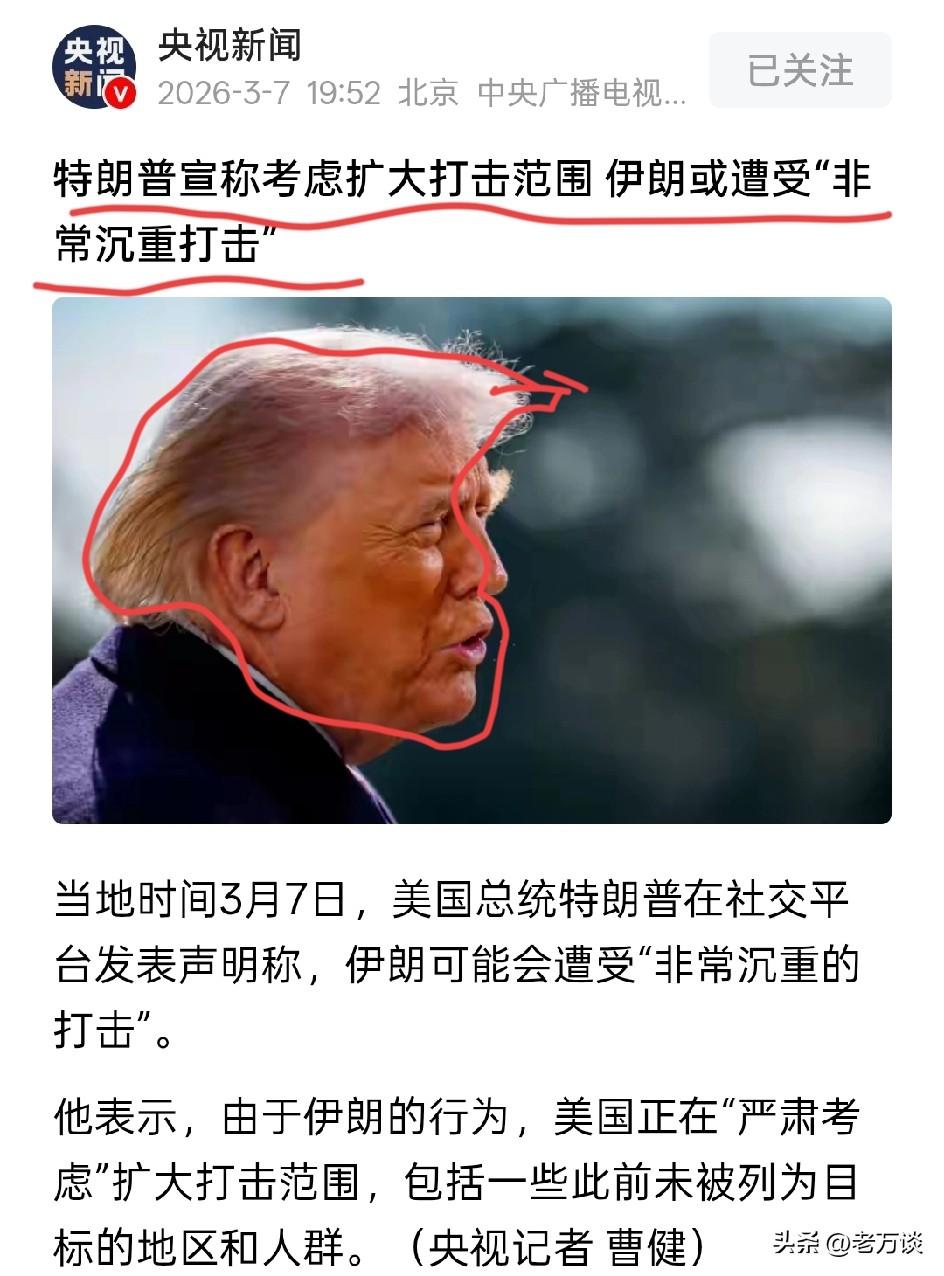 特朗普声称将扩大打击区域,伊朗或遭受“非常沉重打击”。看到这样的新闻,真的是让大家悬着了心再一次绷紧,伊朗人民目前正处于水深火热当中,而美国非但没有停下打击的脚步,反而要进一步要扩大打击范围。下一步美国将打击哪里呢?除了已经打击的军事设施、领导办公区域,难道还打算打击民用设施还是人民百姓的日常生活区域呢?特朗普作为已经 80 多岁的老人家,怎么没有一点善念呢?为什么想的不是尽快地结束袭击,而是要扩大打击区域,让更多的人陷入灾难呢?他看起来好像一直跃跃欲试的战斗公鸡。难道他不要为他的子孙积点福吗?这样让这么多的人非正常的死亡,他真的很高兴吗?作为上帝,难道能够理解他的所作所为吗?