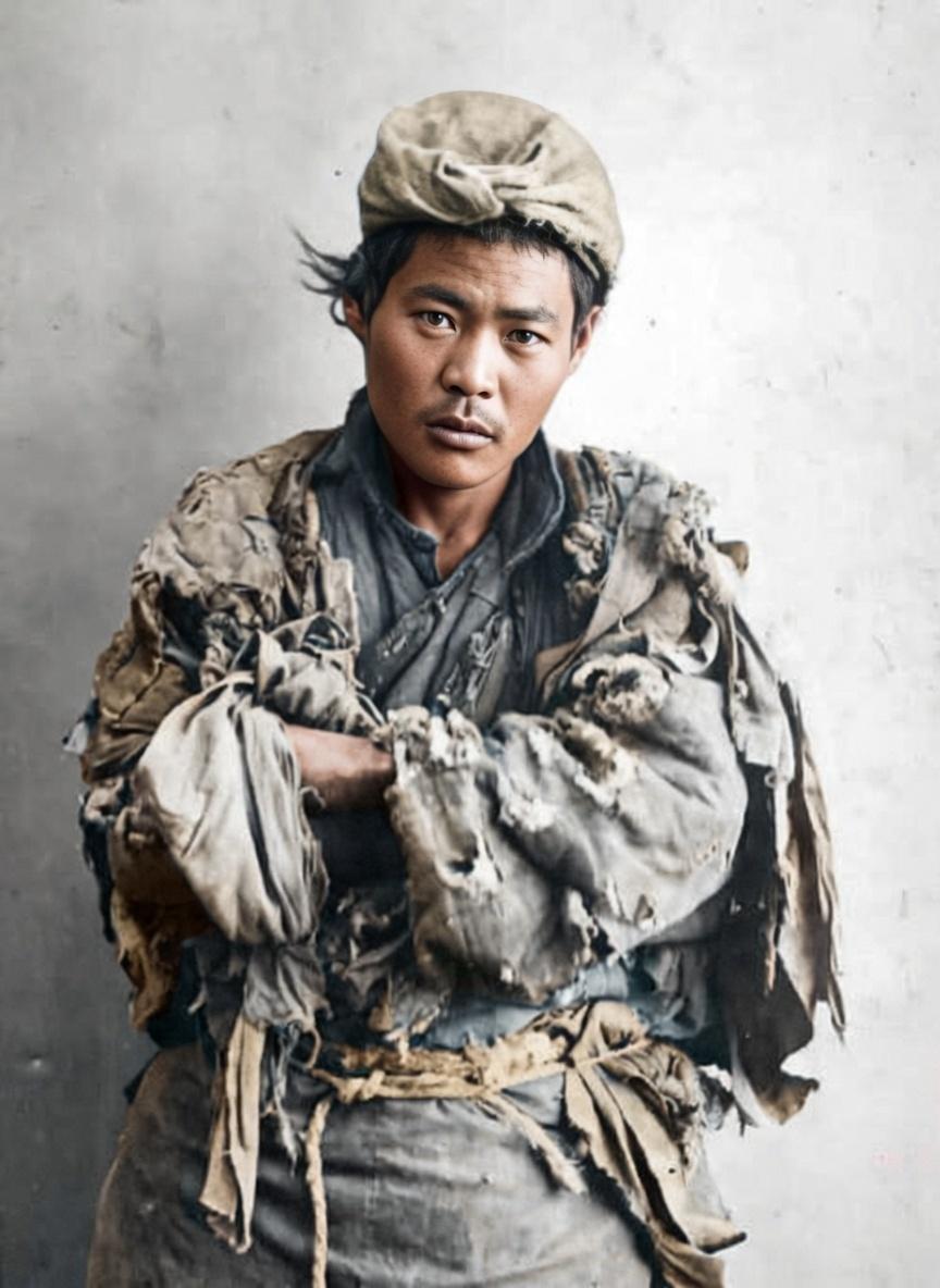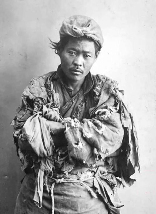 民国初年,一位底层乞丐,他头戴一顶用破布包裹的头巾,身上的衣衫褴褛不堪,层层叠叠的破布几乎无法蔽体,甚至刻意在手臂上缠绕布条,制造出“疮疤”的视觉效果。 尽管身处绝境,他望向镜头的眼神却异常锐利,没有丝毫乞怜的卑微,反而带着一种倔强和警惕。这眼神提醒我们,他首先是一个人,然后才是一个“乞丐”。