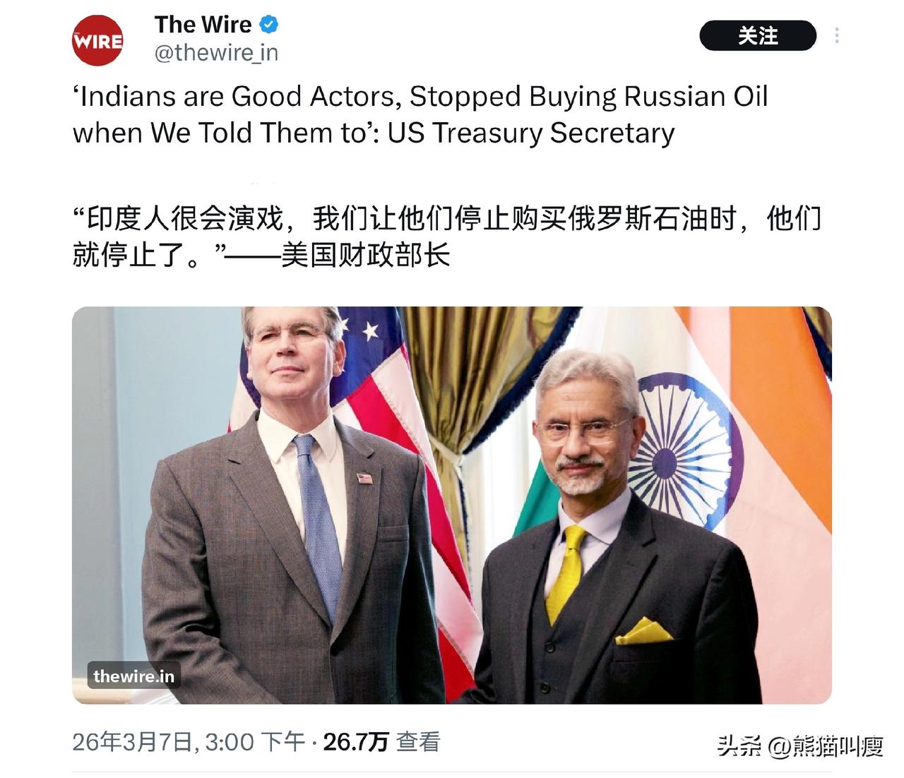 美国财长贝森特“夸奖”印度这句话,伤害不大,侮辱性是有史以来最强。 贝森特就差让印度蹲下,手,转圈,装s了。 此话一出,印度人不淡定了。他们疯狂问AI,贝森特是否真说过这句话。在得到肯定答复后,印度人纷纷安慰自己:【起码我们又能买到原油了,印度必胜】。