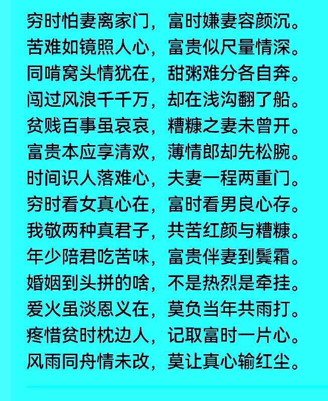 夫妻之间相处,穷时不要怪妻,富时不要嫌妻,苦时不要怨妻,难时不要弃妻。 苦难就像镜子,照出了谁是真心还是伪装;富贵就像尺子,量出了谁是深情还是薄情。很多人能一起啃馒头,却分不了一碗甜粥;很多夫妻闯过了大风浪,结果却翻在了小河沟。 夫妻之间要懂得相互尊重,彼此包容。少一点指责,多一点心疼;少一点冷战,多一点沟通;少一点攀比,多一点知足。长久的感情靠的是日复一日的包容,是年复一年的珍惜。