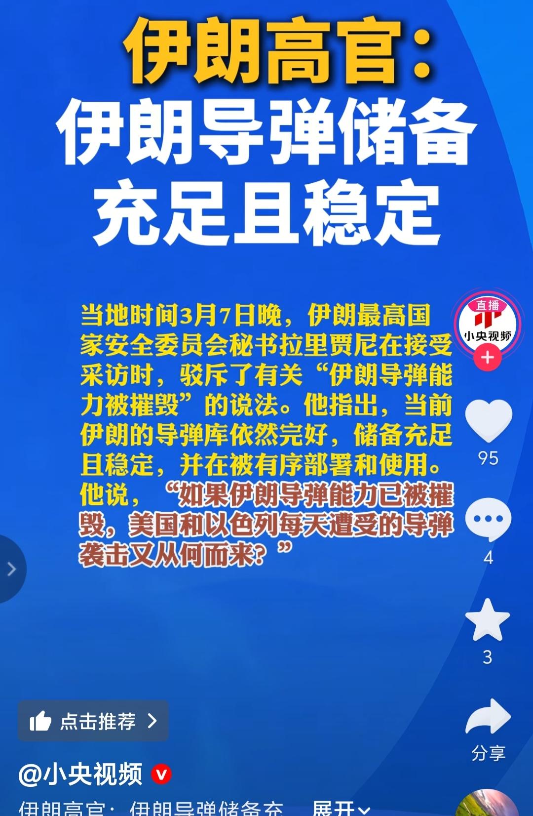 伊朗高官驳斥了伊朗导弹能力被摧毁的说法,他表示,当前伊朗导弹库依旧完好,伊朗导弹储备充足且稳定。 对方放出伊朗导弹能力被摧毁的消息,就是在想让伊朗民众恐慌,制造内部的麻烦,让他们先乱起来。但是这样的假消息一点都不可信,谁都知道要是伊朗的导弹被摧毁,那伊朗当地肯定会发生非常大的大爆炸,但是伊朗并没有发生这样的大爆炸。伊朗即使想掩盖,那也是掩盖不住了。谁都知道弹药库被炸是有多大的波及范围,但是伊朗并没有这样的消息传出。更别说是摧毁伊朗的导弹能力了,导弹爆炸的威力就更大了。 要是伊朗真的没有导弹,那这些天发射的导弹都是从哪里来的,别国送的吗?还是他们从哪里抢来的吗? 伊朗为这样的冲突早就做好就准备,要是伊朗的导弹库那么容易被摧毁,那就不是伊朗了。可以非常肯定的是,伊朗的导弹是非常充足的,完全可以让伊朗持续打一场持久战。