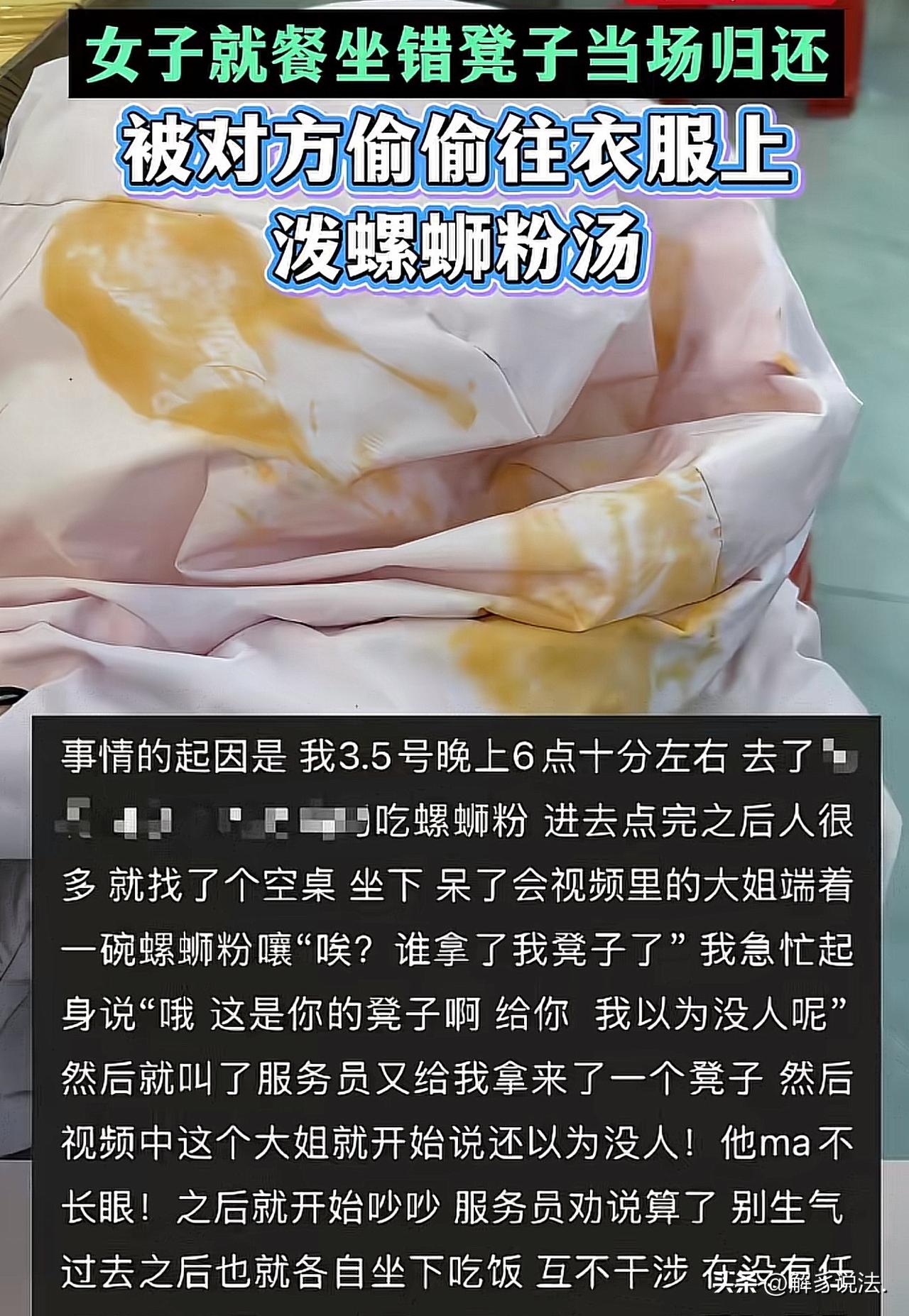 “太坏了!”河北保定,女子在一家螺蛳粉店用餐,期间,因拿错凳子,一位大姐对她骂骂咧咧:他ma不长眼!女子不想惹事,便未与其计较。谁知,女子坐下来用餐时,大姐在她身后使坏,舀了自己碗里一勺热汤水,很自然的转身,将汤水倒在了女子衣服后面的帽子上,然后,跟没事人一样,和同桌朋友继续聊天、用餐。同桌朋友把这一幕看在眼里,习以为常的样子,也未吭声制止。女子回到家里,发现衣服被弄脏,感觉不对劲,赶紧回到店里调取了监控,发现了这一幕,气愤不已,直觉将视频发布到网上。网友:坏的那么自然,是什么样的教育模式,弄出这样的坏种? 3月5日傍晚6点10分,一家螺蛳粉店人声鼎沸,满屋子都是酸辣的气味,客人们挤挤挨挨地找座就餐。 白衣女子刚点完餐,见一张桌子旁有个空凳子,便随手拉过来坐下,想着等餐上桌。 没坐几分钟,一名黑衣女子端着满满一碗螺蛳粉走过来,站在桌旁扯着嗓门儿喊:唉?谁拿了我凳子了? 声音尖锐,瞬间吸引了周围客人的目光。 白衣女子心里一紧,立刻站起身,双手把凳子往对方那边推了推,连声解释:哦,这是你的凳子啊,给你,我以为没人呢! 为了不耽误用餐,白衣女子马上喊来服务员,让其再拿一把凳子。 本以为这事就此翻篇,可黑衣女子却不依不饶,盯着白衣女子的背影,嘴里骂骂咧咧:还以为没人!他ma不长眼! 白衣女子没想到对方会因为这点小事不依不饶,还骂人。但转念一想:多一事不如少一事。便没有回嘴。 服务员赶紧走过来劝解,拉着黑衣女子到座位上,又安抚了白衣女子几句。 随后,两人各自落座吃饭。 白衣女子安安静静地吃着粉,渐渐把刚才的不愉快抛到了脑后,丝毫没有察觉到背后的黑衣女子正在盘算自己。 监控画面清晰地记录下了接下来的一幕。 黑衣女子一边和同桌的人闲聊,一边悄悄观察着白衣女子的动向,手上的动作却没停。 她拿起桌上的小勺,伸进碗里满满舀了一勺滚烫的螺蛳粉汤,趁白衣女子低头用餐、毫无察觉之际,很自然的将勺里泼向白衣女子衣服后面的帽子上,汤汁顺着衣服往下流,瞬间将衣服弄脏了一大片。 做完这一切,黑衣女子又跟没事人一样,把勺子放回碗里,继续若无其事的和同桌朋友聊天、用餐,同桌朋友将这一幕看在眼里,丝毫未表现出震惊,也未进行制止。 白衣女子根本没察觉到任何异样,直到回到家后,脱下外套才发现后背和帽子上满是油腻的污渍,还散发着螺蛳粉的酸辣味,衣服被弄得又脏又湿。 她十分纳闷,自己在店里安安静静吃饭,根本没注意到何时弄脏了衣服,她觉得不对劲,于是立刻赶回螺蛳粉店,调取了店里的监控。 结果监控画面清新的记录下黑衣女的所作所为,她没想到,黑衣女子竟会因为这点小事报复自己,她非常气愤,直接将视频发布到网上,让网友给评评理。 此事曝光后,网友炸锅了,纷纷指责黑衣女子: 这么一点点小事就要报复,很难想象她家人朋友都是怎么相处的。 有人的坏是天生的,脸再纯真,再善良,但是骨子里坏是没法改变的。 请她身边的朋友远离她,请领导开除她,请邻居背后对她指指点点。 《治安管理处罚法》第26条:有下列行为之一的,处五日以上十日以下拘留,可以并处五百元以下罚款;情节较重的,处十日以上十五日以下拘留,可以并处一千元以下罚款:(四)其他寻衅滋事行为。 黑衣女子因坐错凳子的小事,先当众辱骂,后蓄意泼滚烫螺蛳粉汤报复,属于在公共场所无事生非、逞强耍横、无故侵扰他人的寻衅滋事行为。 其行为破坏了餐馆公共秩序,侵害他人人身与财产权益,即便未造成轻伤,也符合治安处罚的寻衅滋事情形,应依法予以拘留、罚款;同时需赔偿衣物清洗或更换的损失。 欢迎关注@解豸说法.