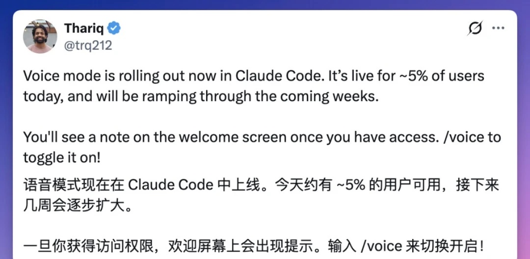 Claude Code 刚上线了语音模式。昨天,Anthropic 工程师 Thariq Shihipar 发了条推文,目前已经有320万次围观。目前已向 5% 的用户开放,未来几周全量推送。 1. 启动语音输入:在终端输入 /voice 并执行,即可开启功能。 2. 纯语音输入:长按空格键说话,松开后自动发送。 3. 混合输入模式:支持打字与语音无缝切换。先手动输入部分提示词,遇到表达瓶颈时,长按空格键口述内容,松手后转录文本会直接插入光标位置(不覆盖已有内容),可继续打字完成输入。