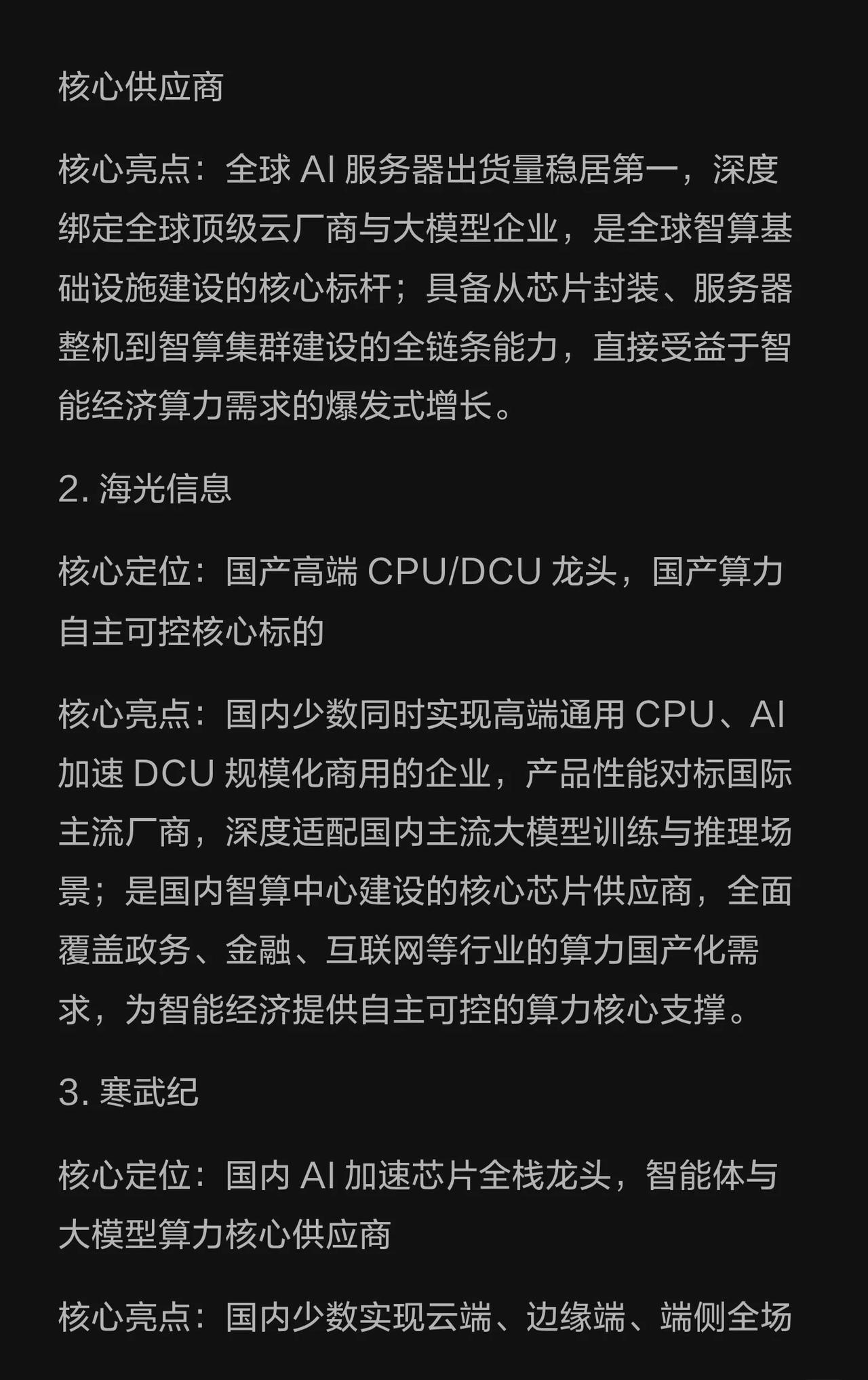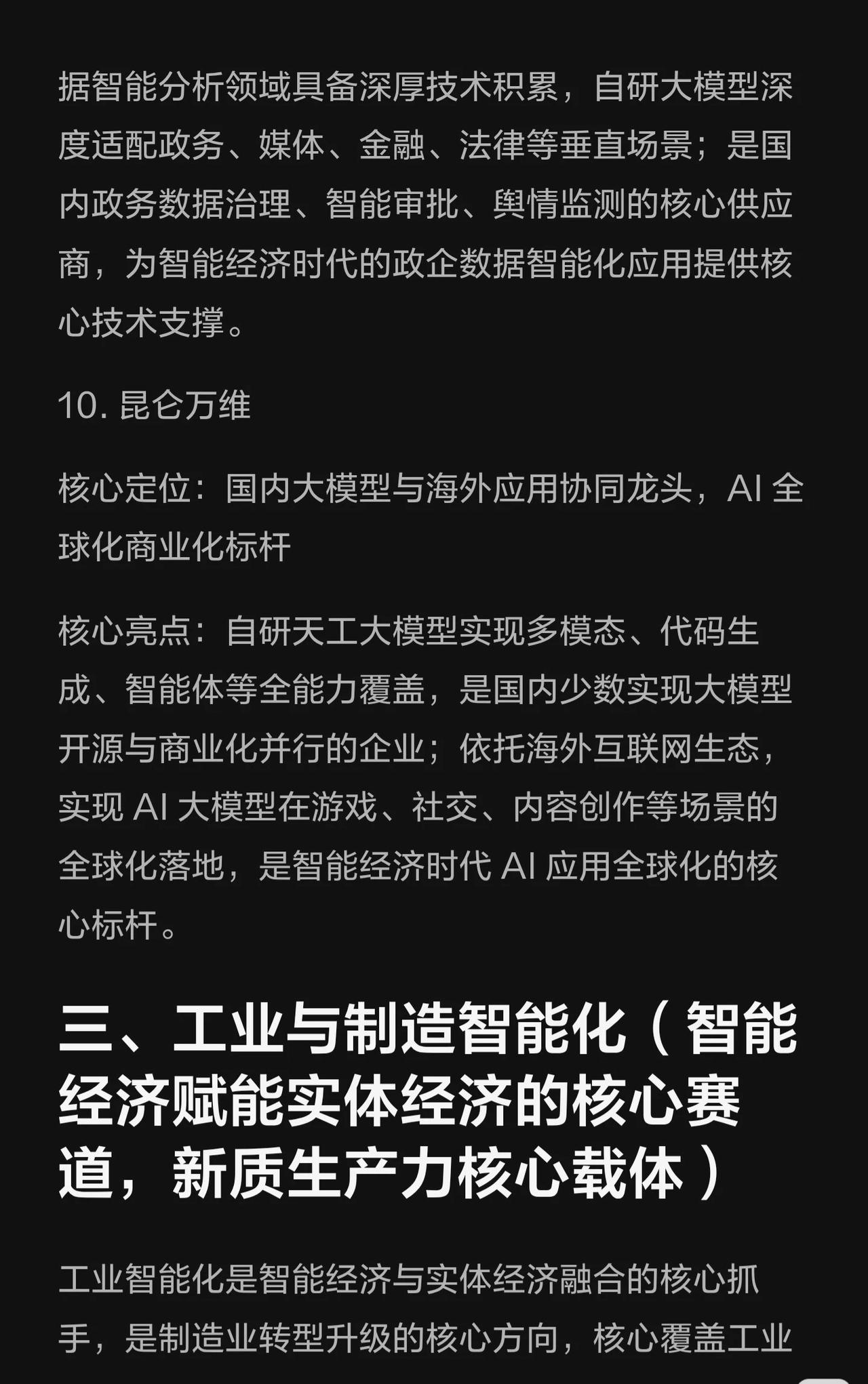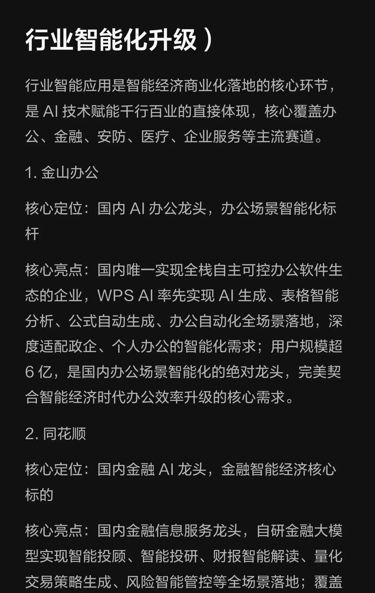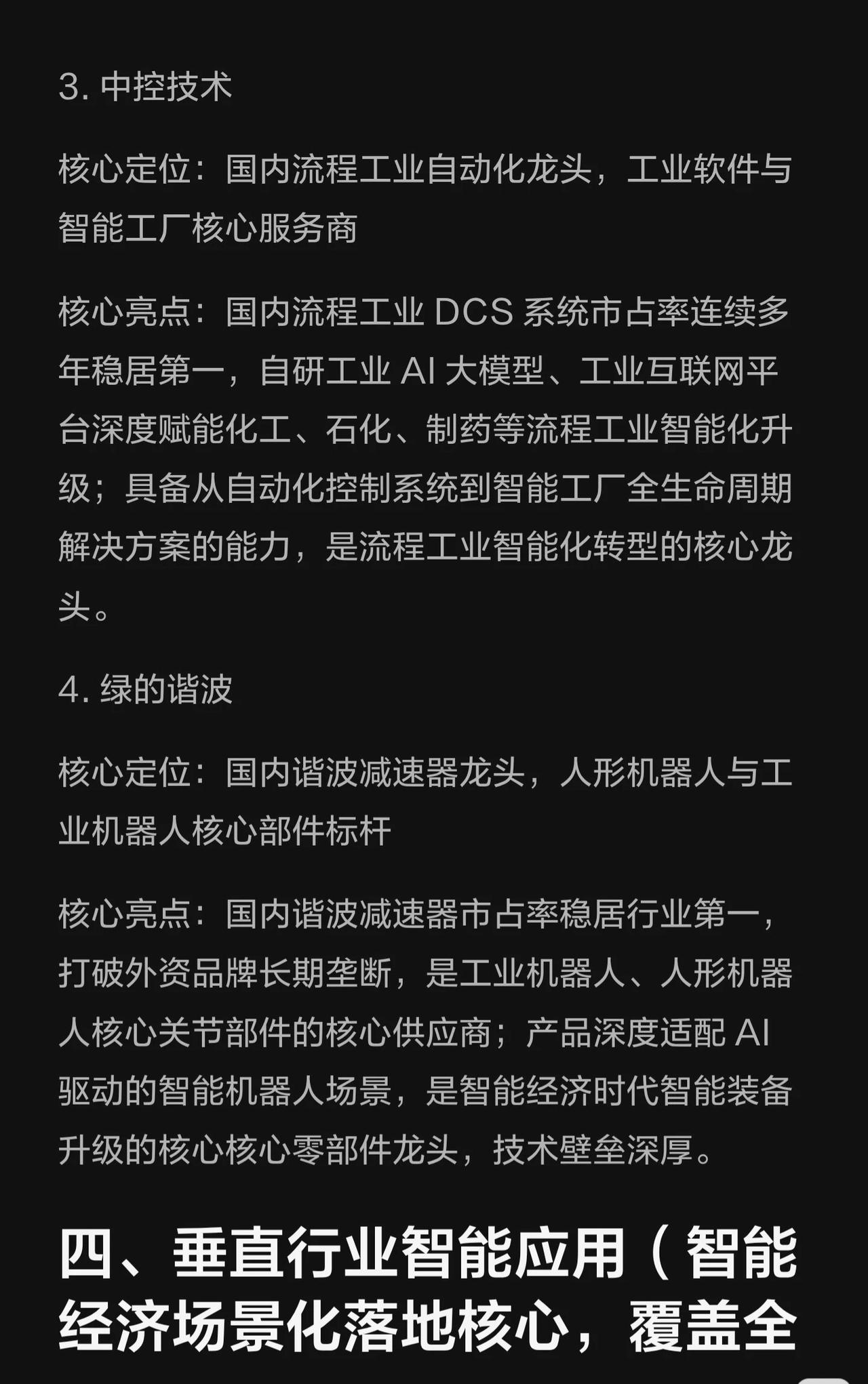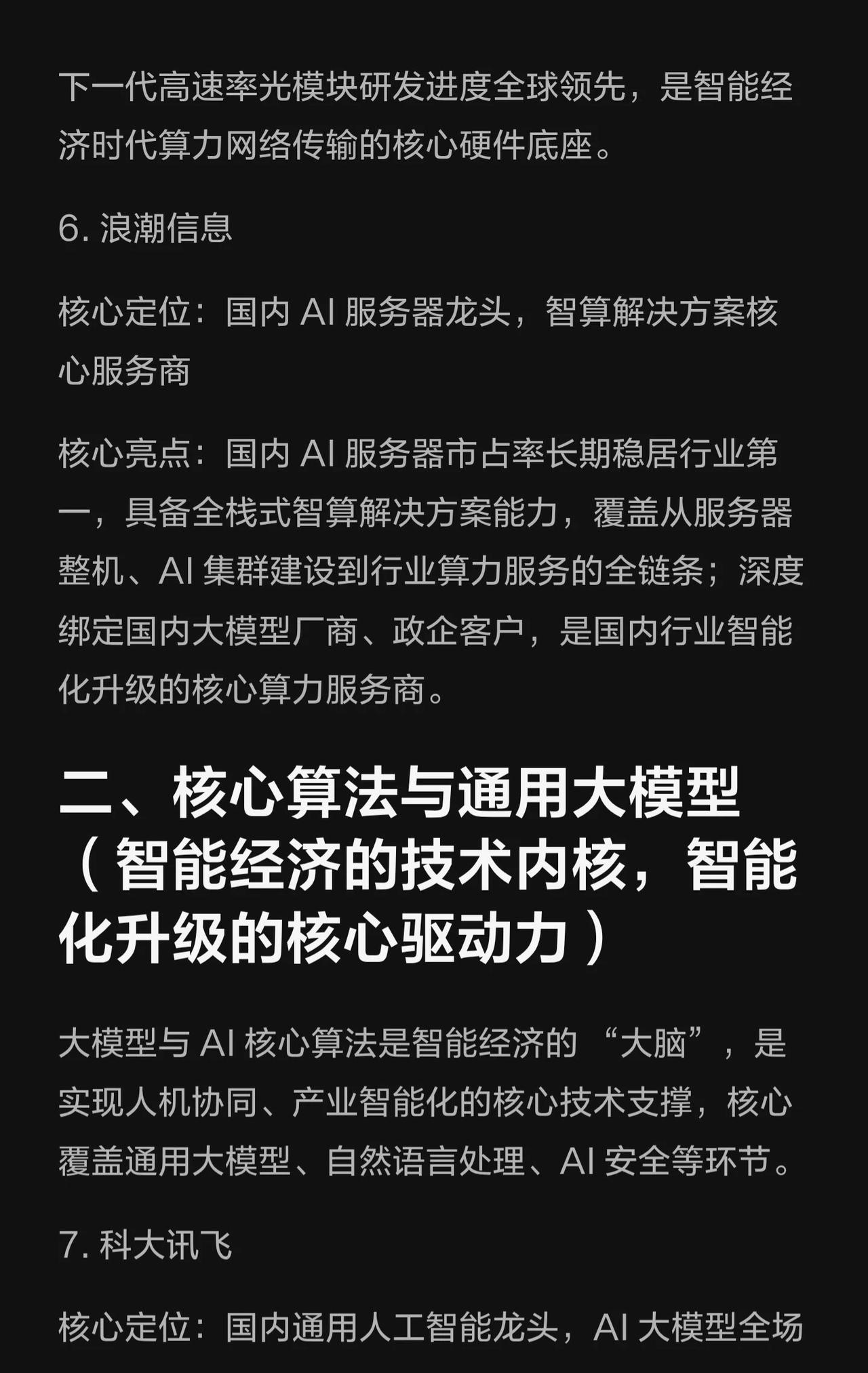 智能经济是AI技术赋能实体经济的新阶段,其发展依赖四大核心支柱,每个支柱都由相应的龙头企业作为核心支撑。 这四大核心支柱及其代表企业分别是: 1. 算力基础设施 (底座):提供智能运行的硬件基础。 * 代表:工业富联、海光信息、寒武纪、中科曙光、中际旭创、浪潮信息。 2. 核心算法与通用大模型 (大脑):提供智能化的技术与驱动力。 * 代表:科大讯飞、三六零、拓尔思、昆仑万维。 3. 工业与制造智能化 (融合抓手):将智能技术落地到实体经济的核心赛道。 * 代表:汇川技术、埃斯顿、中控技术、绿的谐波。 4. 垂直行业智能应用 (场景落地):将智能技术在各行业商业化落地。 * 代表:金山办公 (办公)、同花顺/东方财富 (金融)、海康威视 (视觉/政企)。
