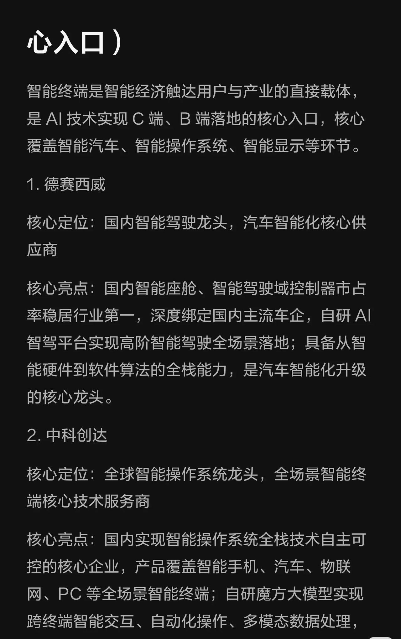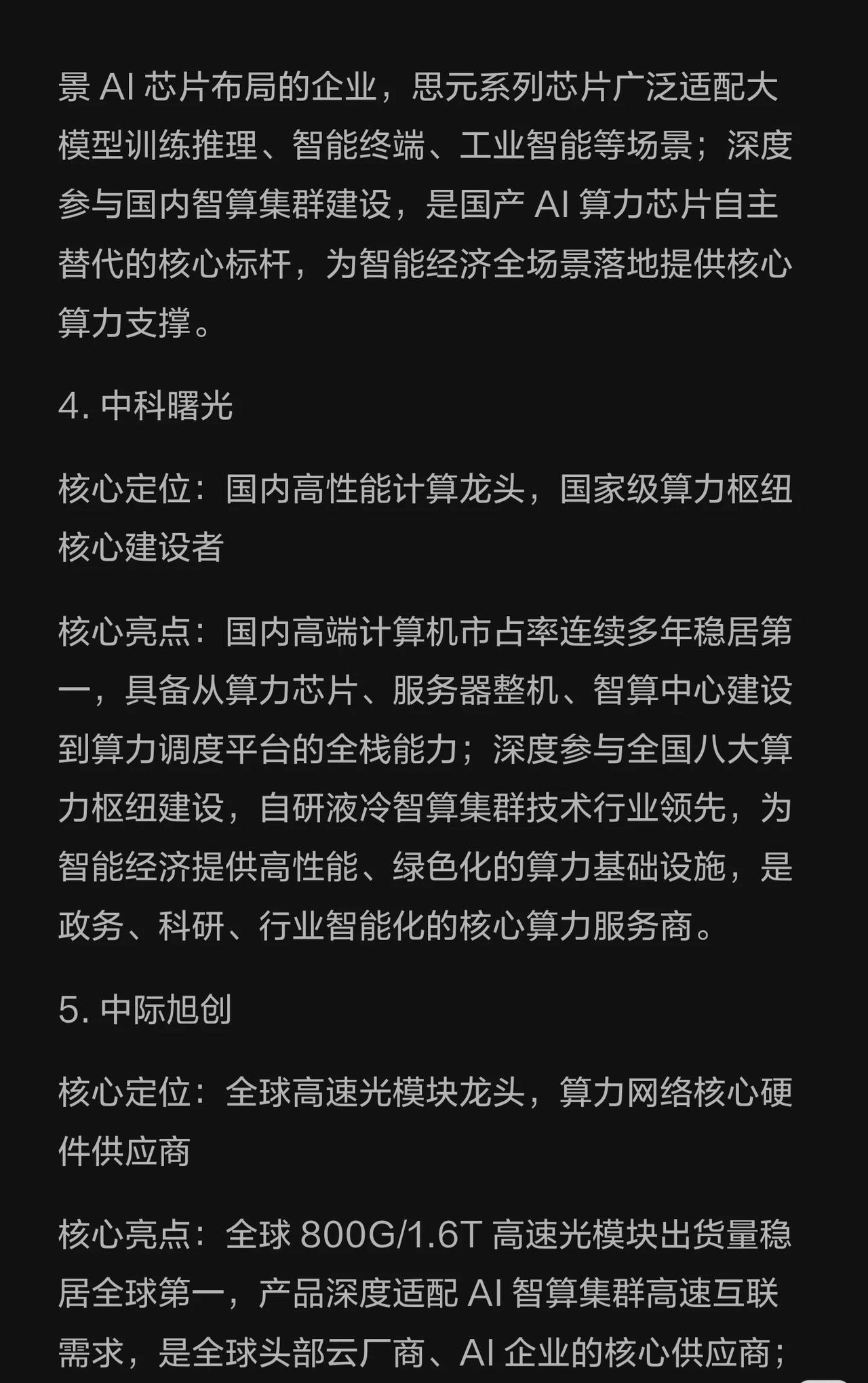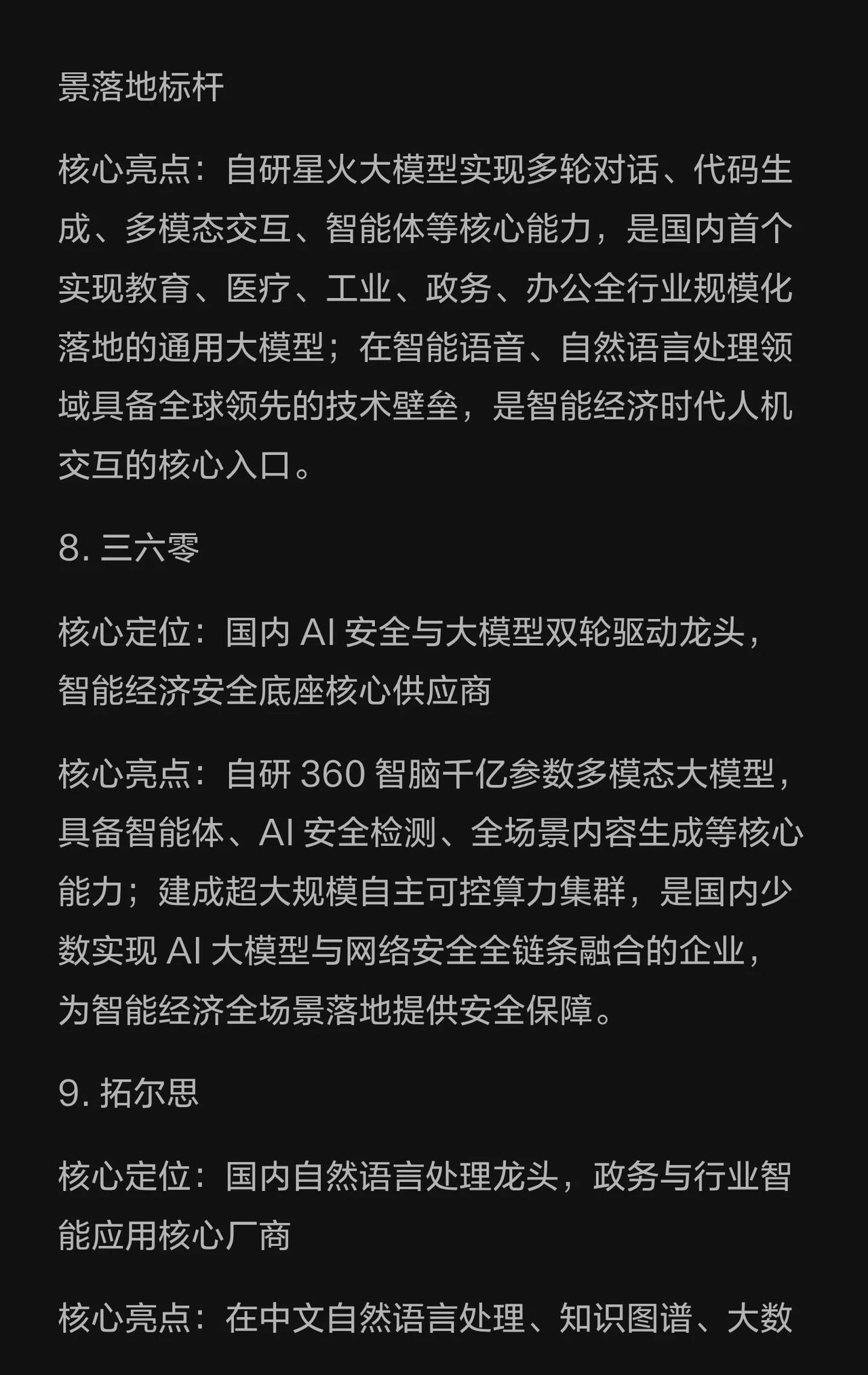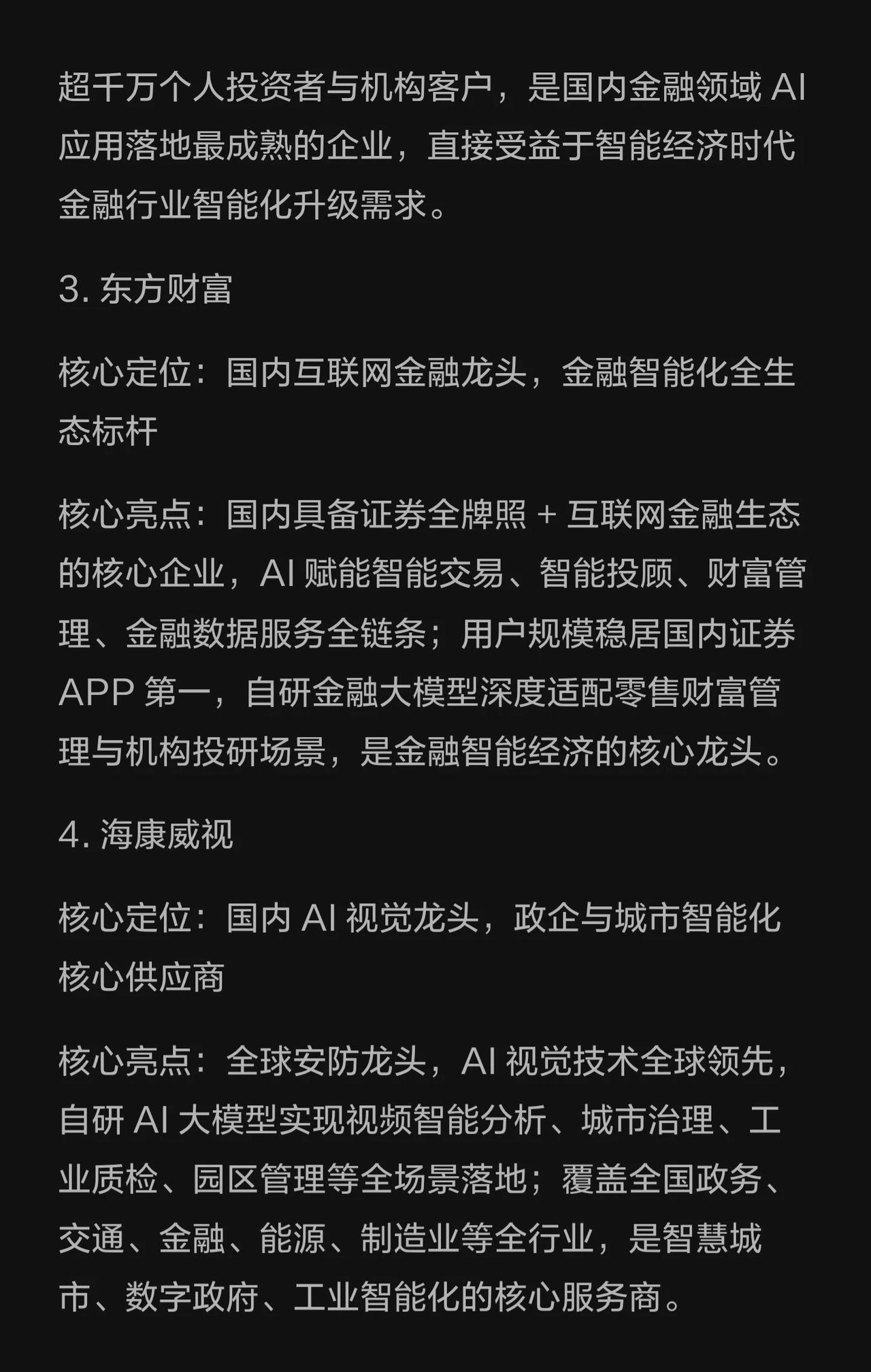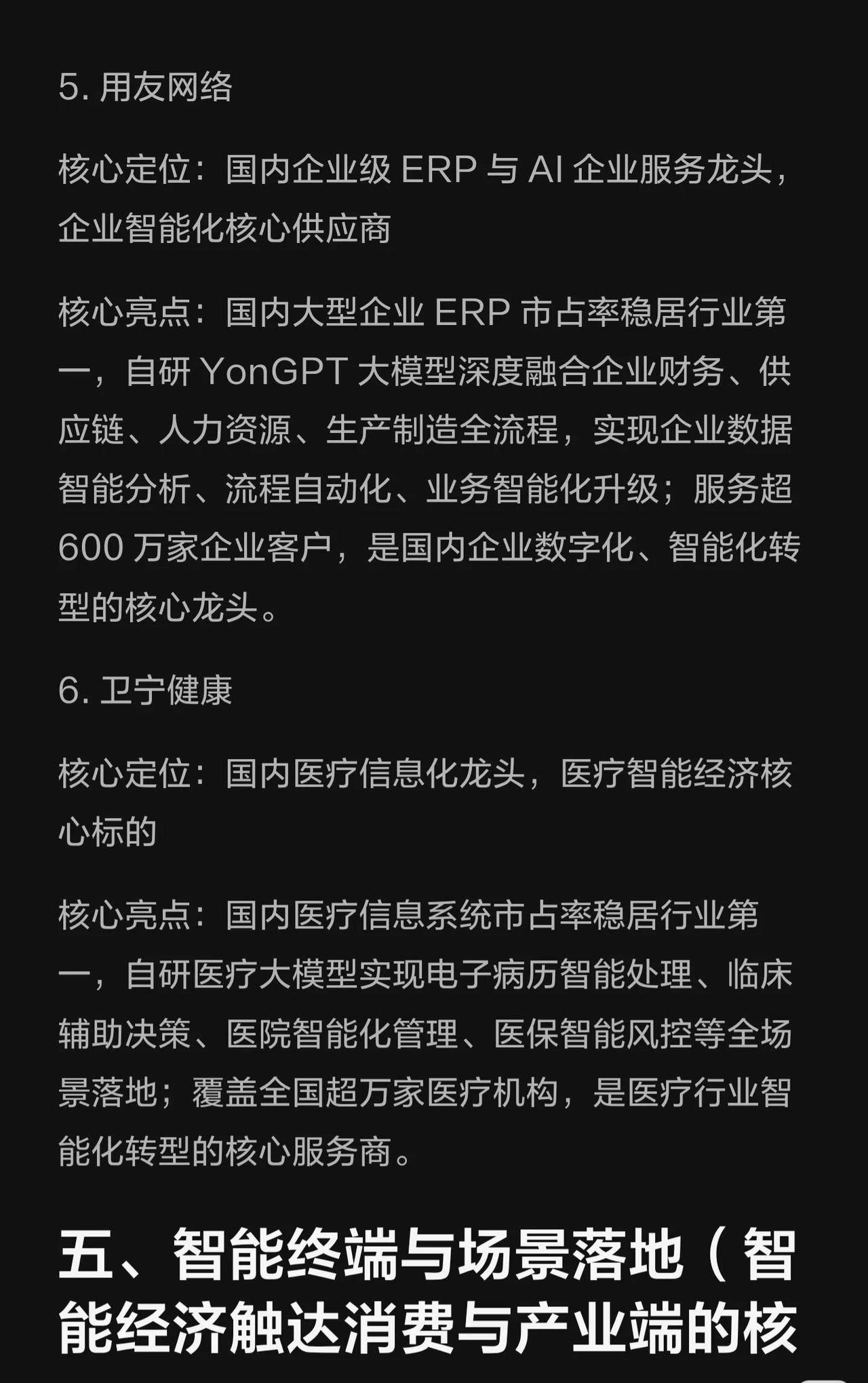 智能经济是AI技术赋能实体经济的新阶段,其发展依赖四大核心支柱,每个支柱都由相应的龙头企业作为核心支撑。 这四大核心支柱及其代表企业分别是: 1. 算力基础设施 (底座):提供智能运行的硬件基础。 * 代表:工业富联、海光信息、寒武纪、中科曙光、中际旭创、浪潮信息。 2. 核心算法与通用大模型 (大脑):提供智能化的技术与驱动力。 * 代表:科大讯飞、三六零、拓尔思、昆仑万维。 3. 工业与制造智能化 (融合抓手):将智能技术落地到实体经济的核心赛道。 * 代表:汇川技术、埃斯顿、中控技术、绿的谐波。 4. 垂直行业智能应用 (场景落地):将智能技术在各行业商业化落地。 * 代表:金山办公 (办公)、同花顺/东方财富 (金融)、海康威视 (视觉/政企)。