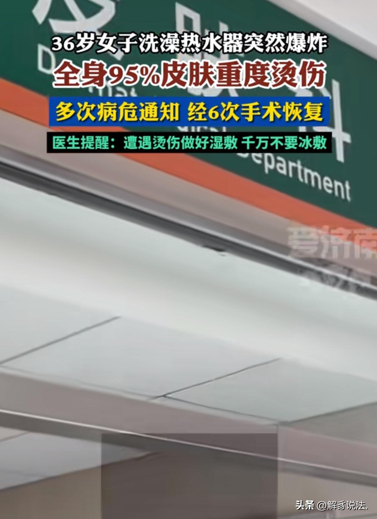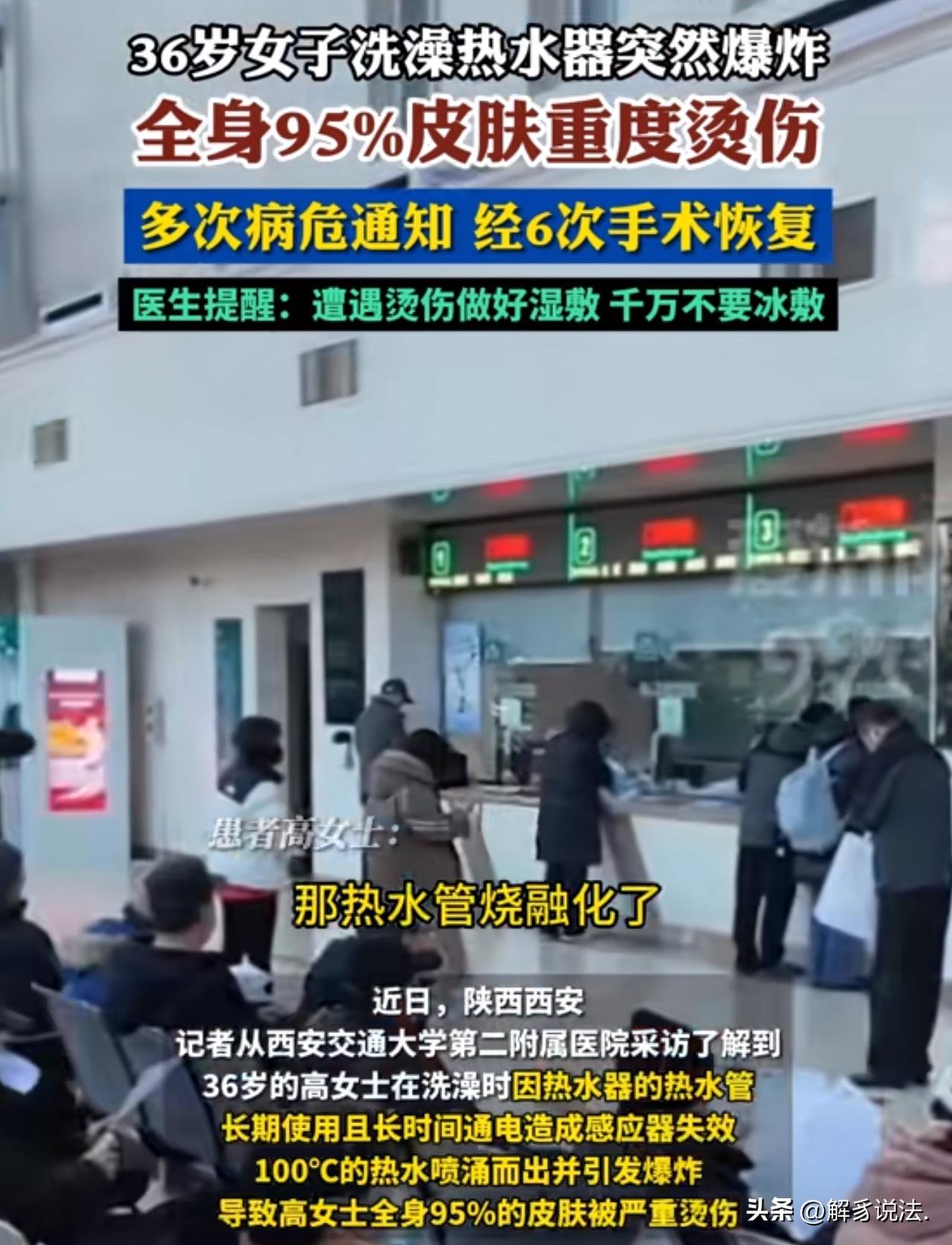 陕西西安,36岁女子在浴室一丝不挂的洗澡,里,突然“砰”的一声巨响,热水器炸裂,100℃的开水从天而降,从头浇到脚,她不急躲闪,痛哭哭喊。家人闻声赶来,将她送进医院。医生诊断为严重烫伤,覆盖面积为95%,多次下病危通知书。不幸中的万幸,医生最终将她从鬼门关拉了回来。事后,女子家人找到热水器厂家讨要说法,没想到,事故原因意料之外! 36岁的高女士怎么也想不到,一次普通的居家洗澡,会让自己险些丧命,在鬼门关前走了好几回。 经历了漫长而痛苦的治疗,高女士总算捡回了一条命。 可躺在病床上的日子,是常人难以想象的煎熬。全身大面积的烫伤让她动弹不得,每一次换药、每一次手术,都伴随着撕心裂肺的疼痛,好几次医院都下达了病危通知书。 家人日夜守在病房外,心急如焚,看着她被病痛折磨,既心疼又无力。 凭借着顽强的意志,高女士一次次挺过难关,如今终于恢复了自主活动能力,也能正常吃饭,慢慢开始康复。 回想起事发当晚的场景,高女士依旧心有余悸。 那天晚上,她和往常一样,把热水器温度调到40多度,打算洗个热水澡放松休息。她刚走进浴室,还没来得及享受热水带来的舒适,热水器突然发出“砰”的一声巨响,瞬间发生故障。 还没等高女士做出任何反应,100℃的沸水就劈头盖脸地浇遍了她的全身。 剧烈的灼痛感瞬间席卷全身,高女士疼得失声尖叫,根本来不及躲避。 家人听到巨响和惨叫声,立刻冲进浴室,眼前的景象让他们吓得魂飞魄散,赶紧将高女士紧急送往医院抢救。经诊断,高女士全身95%的皮肤重度烫伤,伤情极其严重。 脱离生命危险后,高女士和家人决心查明事故原因,为自己讨个公道,想要向热水器相关方维权追责。 可经过专业检测和排查,真相让他们既意外又无奈。 高女士家的这台热水器,已经连续使用了8年之久,早已超过了安全使用年限。 长期使用导致设备内部的温控感应器彻底失效,无法正常控制水温,水温急剧飙升,最终引发管道爆裂,酿成了这场惨剧。 这场意外并非突发故障,而是长期忽视家电安全埋下的祸根。 高女士的遭遇也给所有家庭敲响警钟,家用电器都有使用寿命,超期服役、疏于检修,就等于在家中安放了一颗定时炸弹。 《民法典》第1202条规定:因产品存在缺陷造成他人损害的,生产者应当承担侵权责任。 本次事故是热水器超年限使用、零件老化、温控失效导致,不属于产品本身的制造缺陷,而是使用者长期未维护、超期服役造成。 因此厂家不承担侵权赔偿责任,损失由使用者自行承担。这也提醒大家:家电有安全寿命,到期不换,出了事故只能自己负责。
