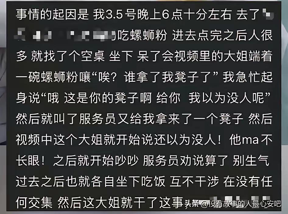 太恶心了!女子螺蛳粉店往陌生女孩帽子里倒汤,监控曝光引众怒! 3月5日,河北保定,螺蛳粉店内,一位女孩和一名黑衣女子,因为座位问题产生了一些误解。 这黑衣女子心眼比针鼻还小! 本来多简单一事儿?人家姑娘发现自己坐错位置,凳子当场就还回去了,一分一秒都没耽搁。换作正常人,接过凳子往下一坐,这事儿就翻篇了。 可这位倒好,凳子到手了还不依不饶,张嘴就是“眼瞎”伺候。吵几句被店家劝开,以为消停了,结果她心里那团火根本没灭,而是憋成了坏水。 最让人膈应的是她使坏的方式。 当面不敢吵、不敢动手,趁人家女孩低头吃粉不注意,舀起一勺滚烫的汤,轻轻巧巧就往帽子里倒。这一下,既解了她心头之恨,又不用正面冲突——典型的“蔫坏”。 这种人我见得太多了:当面怂得很,背地里阴得很。吵完架表面上风平浪静,其实脑子里盘算了八百遍怎么报复。她不要公道,就要让对方吃哑巴亏。 可她忘了,现在满大街都是监控。 女孩把视频往网上一发,全网都看见她那张脸了。本来一碗粉就能解决的事,非要吃成治安案件。根据《治安管理处罚法》,公然侮辱他人或者故意损毁他人财物的,轻则罚款,重则拘留。她那勺汤往人家新帽子里一倒,赔钱是跑不掉的,留个案底也不是没可能。 为了一时解气,把自己搞成“网红”,值吗? 奉劝这位大姐一句:趁着视频传得还不够广,赶紧主动去找女孩道歉,该赔钱赔钱,该低头低头。等警察循着网线找上门,性质可就不一样了。 做人呐,别把心眼都用在算计别人上。你能背后使坏,人家就能让你亮相当“网红”。这世上,终究是抬头做人比偷偷摸摸活得舒坦。