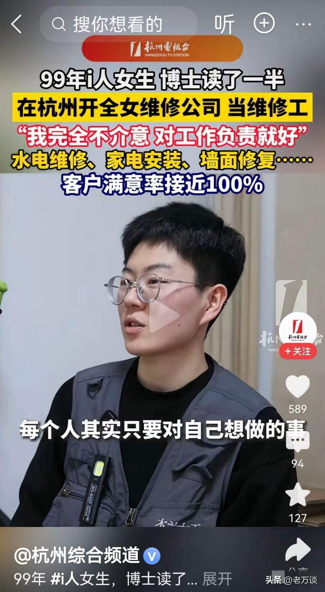 看到一位 99 年的女生,真的是太了不起了,太有主见了。这位女生曾经是博士生,但是她读了一半的博士就不读了,然后开了一家维修公司,转行当维修工了要知道这两项职业完全是牛马风不及,相差实在是太远了,一般人绝不可能放弃博士身份去当维修工。从博士到维修工,99% 点人都难以理解和接受,放弃大有前途的博士生身份,转行当维修工。不论是二者的地位还是社会评价,都相差甚远,但是这位女生坚持自己的主见,坚持当了维修工。从她工作情况来看,得到了绝绝大多数雇主的认可,满意度将近百分之百。坚持自己内心的选择,坚持自己的主意,也许另辟赛道,可以成就非凡的人生。