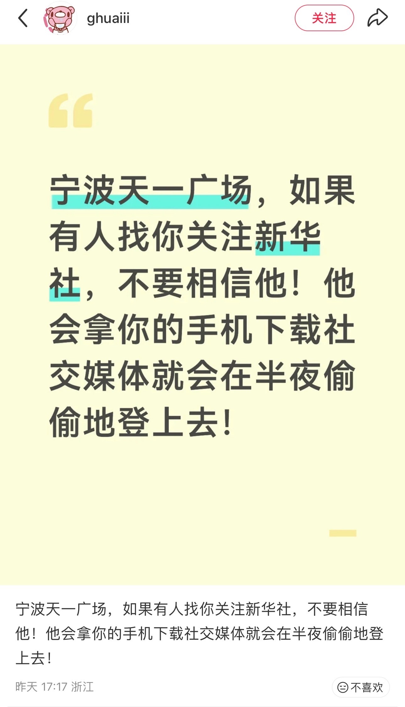 宁波网友提醒在天一碰到这些事赶紧拒绝 网友发帖避雷:宁波天一广场,如果有人找你关注新华社,不要相信他!他会拿你的手机下载社交媒体就会在半夜偷偷地登上去!