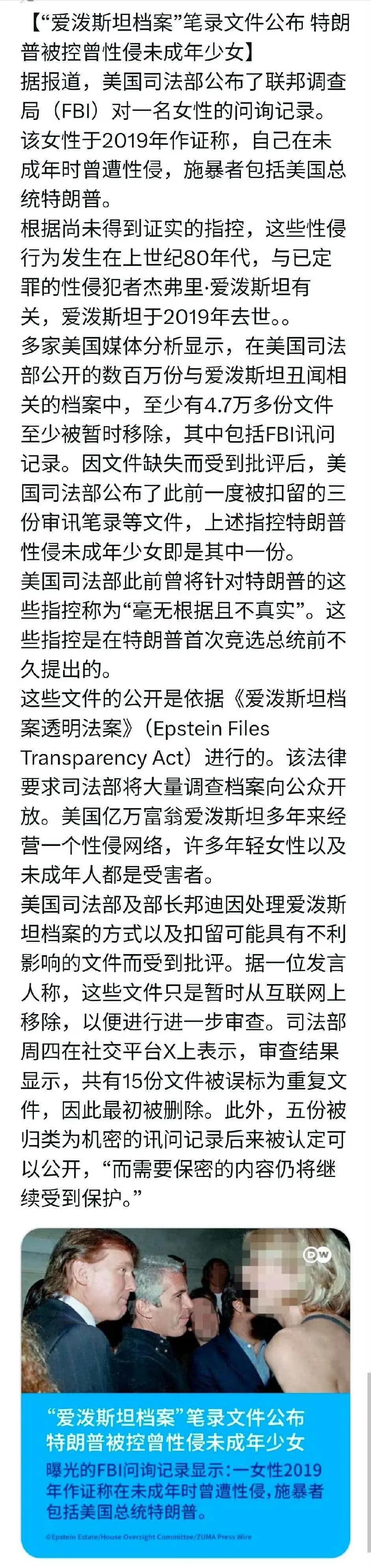 实锤!美国司法部于恰当的时机公布了部分被误扣的“爱泼斯坦档案”文件。文件内容表明,美国现任总统特朗普被控曾性侵未成年少女。这份被曝光的FBI问询记录显示,一名女性在2019年作证称,自己未成年时曾遭性侵,施暴者中包括美国总统特朗普。
