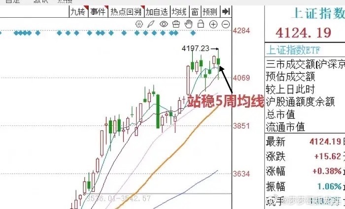 为什么这么预判,三个具体理由:第一,从图一上证指数的周K线图来看,周线级别走出了一颗高位振幅较大的长上下影线的螺旋桨K线走势。这种螺旋桨K线,是一种多空双方有争夺,并且多空的方向还没有最终盖棺定论。从本周的周K线图来看,下影线偏长。下影线向下测试了5周10周均线的支撑,最终收盘在5周均线上方。目前整个周线级别上升形态还没有被破坏。所以如果在这个位置出现下行走势的话,那么主力好不容易经营起来的上升趋势,可能就被破坏掉了。所以在这里,我认为主力在这个位置很可能会以五周均线作为重要的防守线。下一周的周K线有望整体收周线级别的阳线。