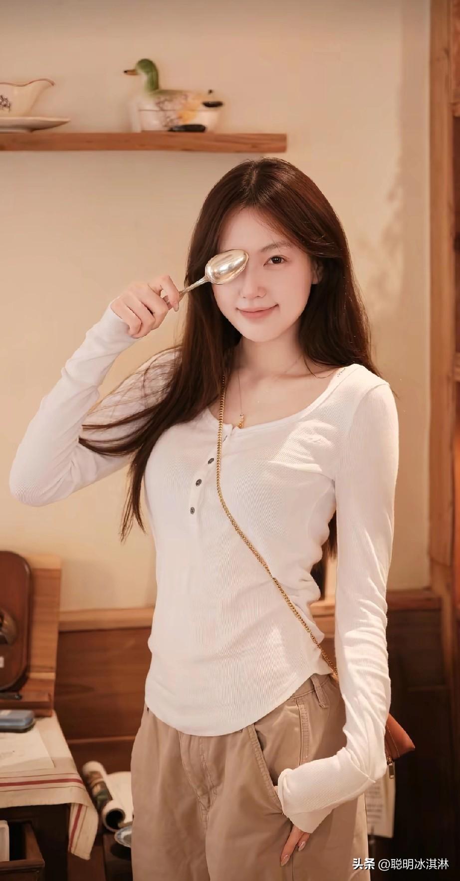 温柔甜美的午后时光,白色毛衣搭配米色长裤,简约优雅。
