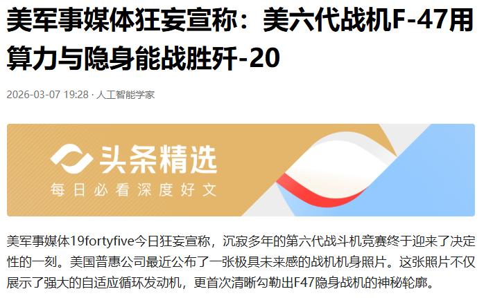 狂妄到没边!美媒吹嘘F-47能赢歼-20,纯属自欺欺人 美国军事媒体又开始吹牛皮了,简直狂妄到没边,居然大言不惭地宣称,他们的六代战机F-47,仅凭算力和隐身性能,就能轻松战胜中国的歼-20。还放话说,六代机竞赛已经迎来决定性时刻,仿佛F-47一问世,就能在天空中横着走,把所有对手都踩在脚下。可说白了,这不过是美国自导自演的一场闹剧,吹得越响,越能暴露他们的心虚,纯属自欺欺人。 这不,美国普惠公司最近放了一张F-47的照片,看着倒是挺有未来感,还展示了所谓的先进发动机,把这款由波音研发的战机吹上了天,说它在隐身和机动性上实现了巨大突破,还把歼-20当成了头号假想敌,一副志在必得的样子。可稍微有点常识的人都知道,一款战机厉不厉害,从来不是靠几张照片、几句吹嘘就能定论的,真要是有本事,就拿出真凭实据,别整天在媒体上喊口号、放狠话。 美媒一个劲吹捧F-47的设计多牛,说它采用了鸭翼和无尾融合布局,既兼顾了机动性,又把隐身做到了极致,还说这种设计解决了传统战机隐身和机动性不能兼顾的难题。确实,从照片上看,F-47抛弃了传统的垂直尾翼,机身做得很光滑,还搞了嵌入式排气管,确实能降低雷达反射和热信号,可这就能说明它能赢歼-20了?未免太天真了。歼-20本身就有着超强的隐身性能和超远的探测距离,早就经过了实战检验,岂是一款还没真正投入使用的战机就能随便超越的? 除此之外,美媒还吹F-47的雷达多厉害,机头雷达罩做得超大,能装下最先进的超远程雷达,说能在绝对安全的距离外锁定歼-20,还能操控无人机群协同作战,靠着超强的算力,能瞬间分析敌情,简直把它吹成了战场主宰。可别忘了,算力再强、雷达再先进,也得经过实战的检验,现在F-47还只是停留在展示照片、渲染构想的阶段,连首飞都还没完成,就敢大言不惭地说能战胜早已形成战斗力的歼-20,这不是狂妄,是什么? 更可笑的是,美国一边吹嘘F-47有多厉害,一边其实是在给自己壮胆。这些年,中国的歼-20在太平洋频频亮剑,展现出了超强的战斗力,让美国感受到了前所未有的压力,他们急需要一款“王牌战机”来给自己和盟友打气,F-47就是他们拿来炒作的工具。说白了,他们吹嘘F-47能赢歼-20,不过是想掩盖自己在六代机竞赛中并不占绝对优势的事实——要知道,中国的六代机早已完成首飞,比美国的F-47进展还要快,美国这是怕了,才急着靠吹嘘来找回面子。 不可否认,F-47在设计理念和部分技术上确实有可圈可点之处,比如无尾布局、先进雷达和算力优势,但这并不代表它就能轻松战胜歼-20。空战从来不是单一技术的比拼,而是综合实力的较量,歼-20经过多年的发展,不仅技术成熟、战斗力稳定,还在不断升级改进,早已形成了完整的作战体系。而F-47还只是一个“半成品”,哪怕未来真的投入使用,想要超越歼-20,也绝非易事。 美媒的狂妄吹嘘,本质上还是美国霸权思维在作祟,他们习惯了自封为“世界第一”,见不得其他国家在军事领域超越自己。可时代早就变了,中国的军事力量不断崛起,歼-20的实力有目共睹,不是美国几句吹嘘就能否定的。美国与其整天在媒体上自欺欺人,不如静下心来好好搞研发,不然等到中国六代机正式投入使用,美国所谓的“F-47优势”,只会变成一个天大的笑话。说到底,靠吹嘘赢不了战场,真本事才是硬道理,美国的狂妄,迟早会被现实狠狠打脸。