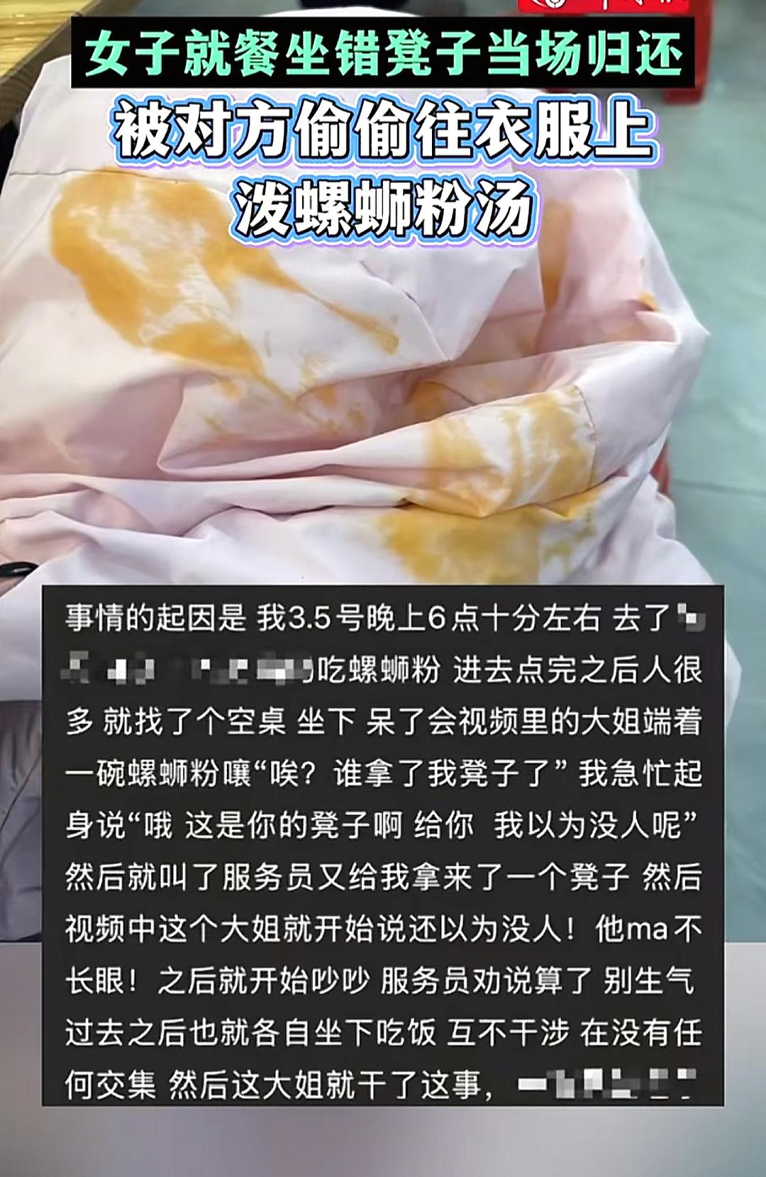 被泼螺蛳粉汤的女子已报警,严肃表示要追究到底,那大姐可能面临3个窘境,这下没那么容易脱身! 一、行政处罚。大姐在公共场合故意往他人帽子里倒热汤,这明显是主观恶意的寻衅滋事,即使没有伤害到当事人的身体,但是已经是公然侮辱他人、扰乱公共秩序了! 按照情节的轻重,拘留肯定少不了,说不定还会留下记录,这下子女考公、参军都有影响,这家里人不得恨她。 二、民事赔偿。螺蛳粉汤倒进了帽子里,这等于说损坏了他人财物。并且也不是不小心的,分明是故意为止。所以大姐大概率要进行原价赔偿,不单单是洗洗这样。 三、彻底社死。事情曝光后上千万人都刷到了,这不就是公开处刑吗?相信她的朋友、家属、公司大概率能看到,有点小心眼都可以接受,但她的程度令人恐惧 ,谁愿意和心胸狭隘、背后使坏的人打交道? 说不定工作还不保,走在小区里还得掩面把自己遮好了,走到哪都被人指指点点,名声一旦毁了,再想挽回比登天还难。 这位大姐现在都没站出来认错,可见本身就是个恶人,压根不觉得自己有错,这种人就是自私自利又小心眼,大家觉得呢