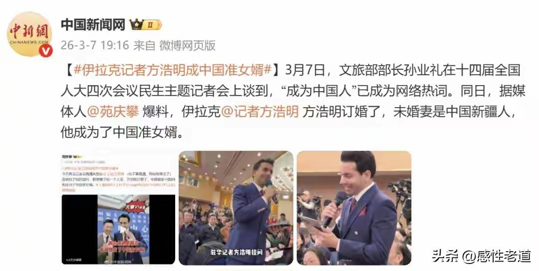 伊拉克记者方浩明订婚的消息温暖了全网,这位说着一口流利中文、真诚又通透的外国小伙,正式成为中国准女婿,他的未婚妻,是一位温柔善良的新疆姑娘。而比爱情更让人破防的,是他在采访里说的那句真心话:希望中东人也能过上中国人的生活。 短短一句话,藏着一个从战争里长大的孩子,对和平最极致的渴望。 方浩明的人生,从出生起就被战火笼罩。2000年他在伊拉克出生,三岁就遭遇伊拉克战争,随后全家逃亡叙利亚,可没过多久,叙利亚又陷入战乱。从1岁到11岁,他的整个童年,不是在避难所里蜷缩,就是在躲避轰炸的路上,耳边永远是枪炮声,眼前永远是破碎的家园。他不知道安稳睡觉是什么滋味,不知道不用害怕是什么感觉,不知道正常的童年该有玩具、课堂和烟火气。 他亲眼见过家园被毁,亲眼目睹亲人颠沛流离,就连深夜听到烟花声,都会本能地扑进家人怀里,以为又是空袭来临。直到11岁来到中国,他才第一次走进正规教室,第一次走在深夜无人打扰的街头,第一次明白:原来人可以不用活在恐惧里,原来日子可以过得这么踏实。 他说,直到在中国生活,才真正懂得什么是和平。 我们生在和平里,长在安宁中,很难真正体会他的感受。我们觉得理所当然的日出日落、上下班通勤、家人团圆、夜市喧闹、深夜散步,在他眼里,都是遥不可及的幸福。我们觉得平淡的日常,是中东无数百姓拼尽一生都换不来的奢望。 最近中东局势再度紧张,美以与伊朗的冲突不断升级,炮火再起、人心惶惶。方浩明看着家乡的消息,一次次红了眼眶。他说,自己每天都收到家人发来的战争视频,心里满是心酸。他这辈子最大的愿望,就是亲眼看见中东实现和平。 他羡慕中国,不是羡慕高楼大厦,不是羡慕科技繁华,而是羡慕我们拥有不用担惊受怕的每一天。 他爱上中国,也不仅仅是因为这里的生活安稳,更因为这片土地的包容与温暖。他在这里没有歧视,没有漂泊,遇到了相知相爱的新疆姑娘,一爱就是五年,从校园走到订婚,把异乡变成了归宿。对一个从小逃亡、居无定所的人来说,家这两个字,比什么都重。 他的故事,也是整个中东地区近几十年的宿命。无数人从出生就面对战争,长大就经历流离,好好活着、平安度日,成了最奢侈的梦想。他们不是不努力,不是不向往美好,只是命运没有给他们一个和平的起点。 而方浩明最让人感动的,是他历经苦难,却依然温柔;见过黑暗,却依然向往光明。他没有怨天尤人,没有愤世嫉俗,只是真心希望自己的同胞,也能拥有我们习以为常的和平生活。 我们总觉得日子平淡,总为小事烦恼,可在方浩明这样的人眼里,我们拥有的,是全世界最珍贵的财富。 国泰民安,山河无恙,人间安稳,家人团圆。 这不是口号,是无数人用生命守护的结果,也是远方无数人梦寐以求的天堂。 祝福方浩明,愿他在中国永远幸福安稳。 也愿战火早日熄灭,愿世界每一个角落,都能像中国一样,灯火可亲,岁岁平安。
