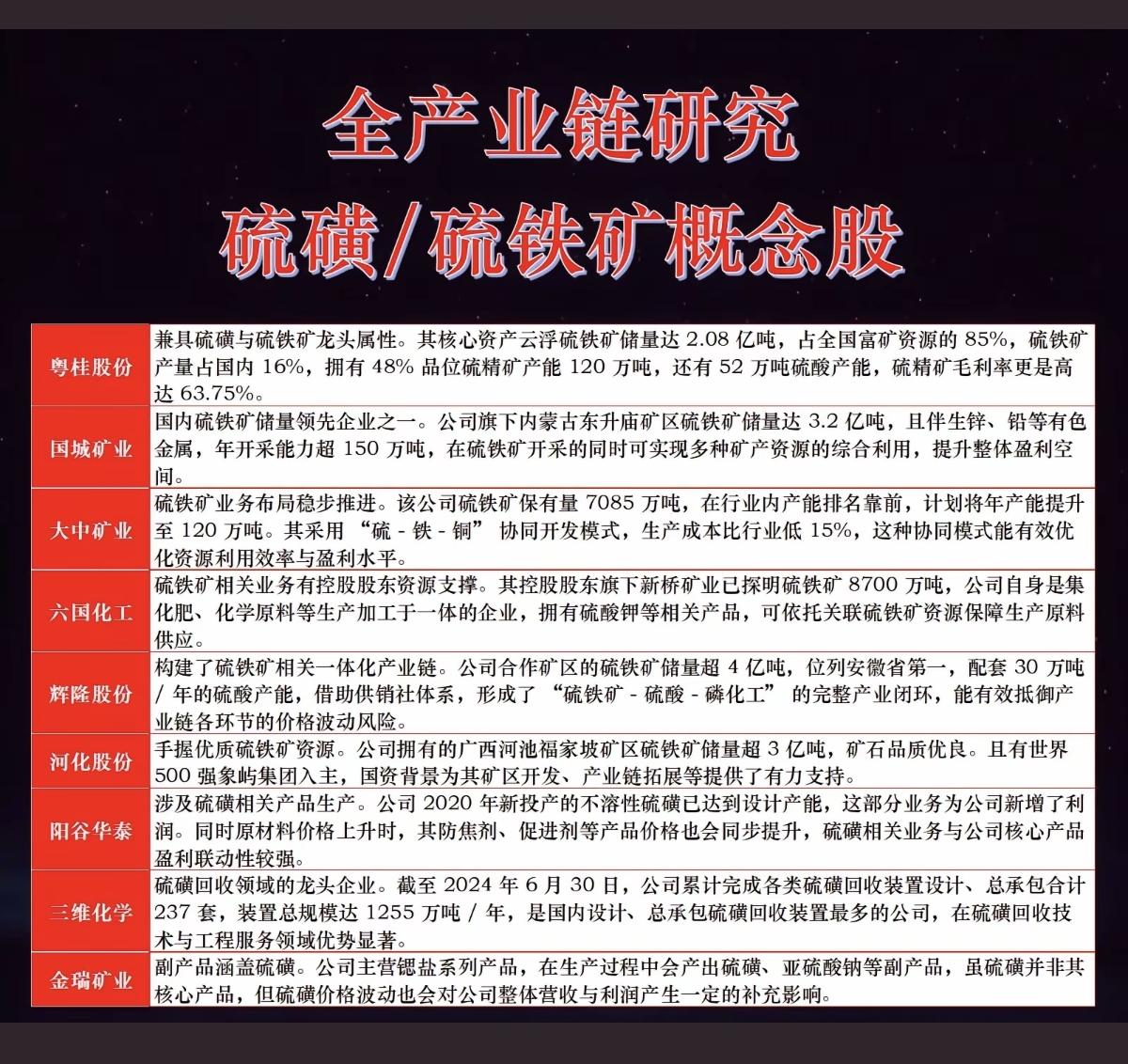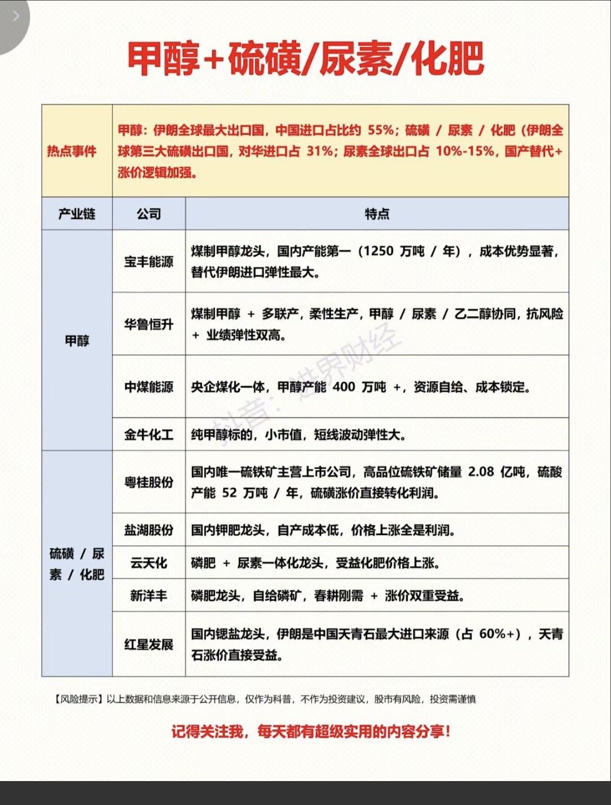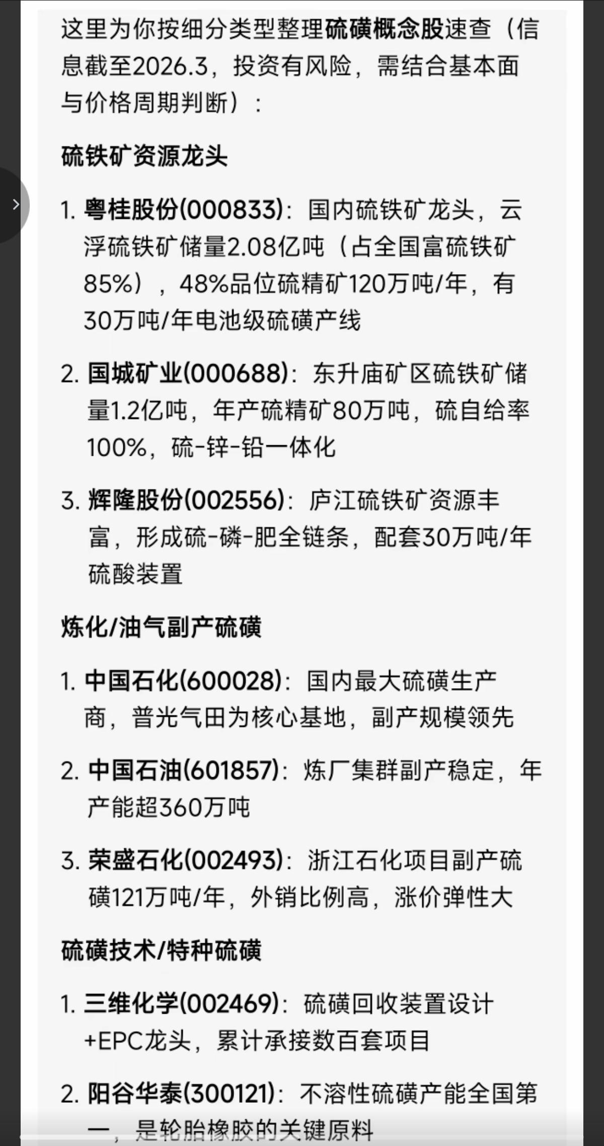 3.8周日 硫磺涨价概念! 美以伊冲突,导致部分化工产品供应链扰动,甲醇、硫磺价格跳涨! 相关硫磺概念股梳理: