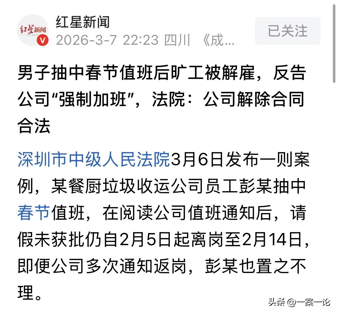 广东深圳,男子在餐厨垃圾收运公司工作,他被抽中春节值班后很生气,认为公司这是强制加班,请假未果后,男子干脆撂挑子,一天也没去,任凭公司怎么通知他返岗,他都装没看见,公司也不惯着,直接以男子旷工三天为由将其解雇,男子不服,反手就起诉公司索赔。网友:不是说值班不算加班,那怎么能算旷工? 大过年的,谁不想在家里舒舒服服待着?36岁的彭某心里也是这么想的。 他是某餐厨垃圾收运公司的员工。今年春节排班,他“中签”了,被排在了春节期间值班。 看着墙上贴的值班表,彭某心里那个堵得慌,觉得公司就是故意整他,这大年初一还要去收泔水,简直就是强制加班! 2月5号,本应该他上岗的日子,可彭某心里一横,撂挑子不去了。 他没去公司办任何请假手续,也没找领导当面说,直接就在家猫起来了。 他想着,反正我不去,你们还能把我抬去不成? 然而,公司这边可急了。春节期间,餐厨垃圾量大,环卫工作又是城市运行的保障,少一个人就是少一份力。 领导看彭某没来,电话一个接一个地打,通知他赶紧回岗位上来。 可彭某呢,电话干脆不接,人就是不露面。 从2月5号到2月14号,整整10天,彭某就像人间蒸发了一样。 公司的催岗通知书发了好几份,有的寄到家里,有的发微信,甚至还托人带话,告诉他“再不回来就算旷工,要被开除的”。 彭某心里其实也是忐忑的,但他赌的就是公司不敢真开除他。 他觉得自己平时工作也没出啥大错,就这一次没去,顶多扣点钱,还能咋地? 再说了,他觉得自己占理,因为是公司逼他加班在先的。 到了2月14号,公司的一纸解除劳动合同通知书彻底打破了彭某的幻想。 理由就是,彭某连续旷工超过3天,严重违反公司规章制度。 这下彭某委屈了,觉得自己特别冤枉,他一纸诉状把公司告上了法庭,张嘴就要赔偿金。 彭某说,公司大过年的安排我值班,这就是强制加班!我不去是合理的反抗! 可法庭上,法官问彭某:你说公司强制加班,你有证据吗?比如你当时提出过书面异议吗?或者有录音、聊天记录证明你反抗过吗? 彭某愣住了。他当时就是心里不爽,直接走人,也没想过什么证不证据的。他支支吾吾半天,啥也拿不出来。 《劳动合同法》第39条规定:劳动者有下列情形之一的,用人单位可以解除劳动合同:严重违反用人单位的规章制度的…… 法官认为,彭某所在的公司负责餐厨垃圾收运,属于公共服务行业,越是节假日越忙,春节排班是合理的,而且公司早就贴了通知,尽到了告知义务。 彭某不爽可以提意见,但不能没办手续就直接消失。 法官认为:你是成年人,请假要走流程这是基本常识。公司多次叫你回来你不理,这不是旷工是什么?你说强制加班,口说无凭,法律讲的是证据。 最终,法院驳回了彭某的全部诉讼请求。 法律赋予劳动者批评、建议的权利,但未赋予“不辞而别”的特权。 彭某请假未获批即离岗,且在公司多次催告下仍拒绝返岗,连续旷工达10天,远超通常企业规定的“连续旷工3天”红线。 这种行为不仅是对劳动纪律的挑战,更因其岗位特殊性,可能对城市公共服务造成潜在影响。 法院判决强调了“证据为王”的原则。彭某主张“强制加班”却拿不出任何实证,其“消极抵抗”不构成合法的抗辩理由。 这个法条也明确了劳动关系中的边界:即便对工作安排不满,也应通过合法渠道申诉,而非采取极端旷工方式,否则将面临失业且无赔偿的法律后果。 这下彭某后悔了。原本想着赌口气,结果把饭碗彻底砸了,一分钱赔偿没拿到。 所以说,职场上,规则就是规则,不管你心里多不痛快,手续得办,班得上。任性旷工,最后买单的只能是自己。 有人看后就问,不是说值班不是加班?那怎么算旷工呢? 不过这种公共服务属性的行业,过年值班正常得很。就像医生,过年值班,实质上也是上班,有病人,该治疗还是得治疗,但是从来没听说医生过年值班算加班费的。 对于这件事,你怎么看? 欢迎关注@一案一论
