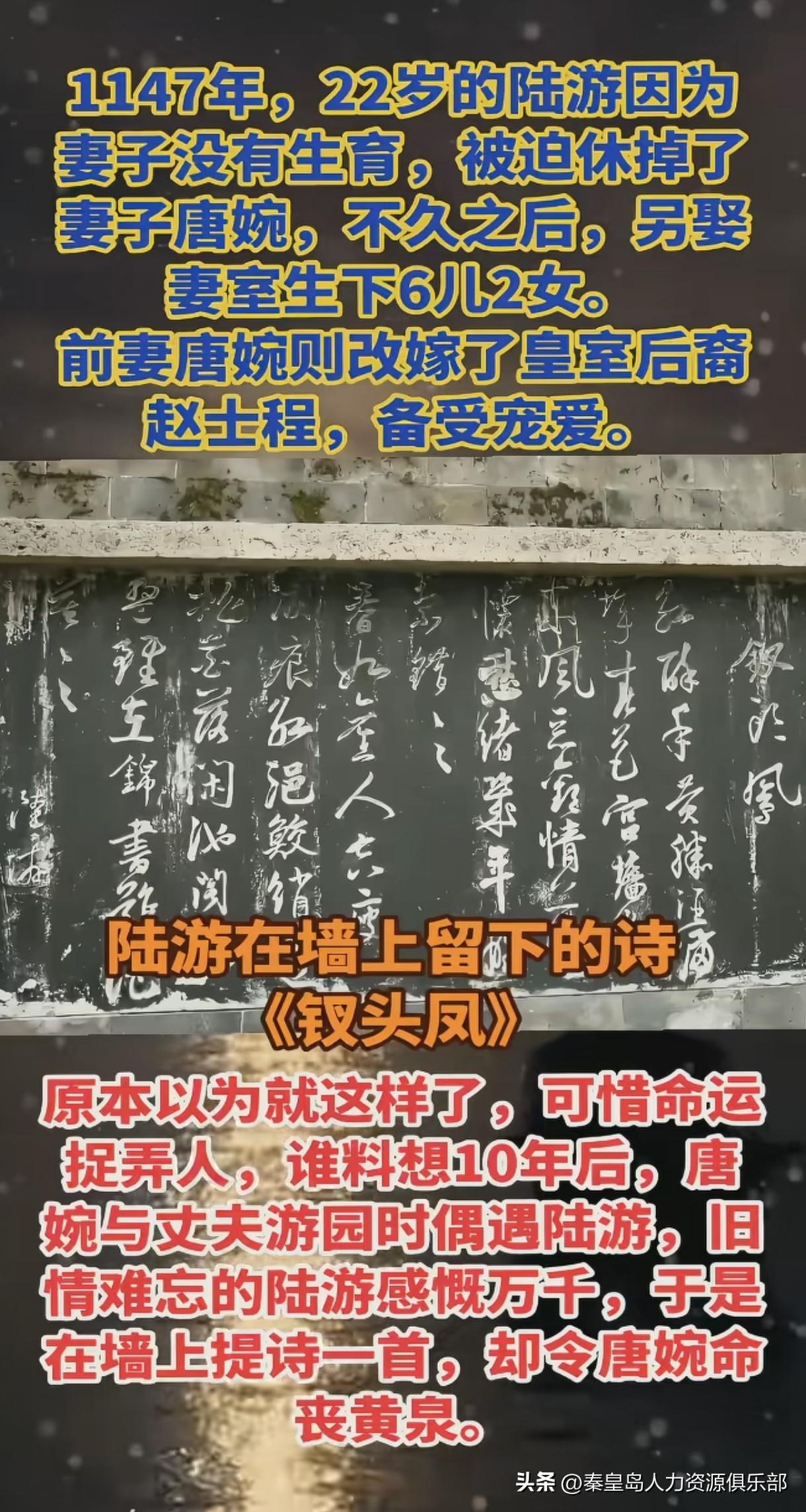 陆游《钗头凤》害死前妻?打工人的千古意难平! 今天刷到个历史八卦,把我给看emo了。原来陆游在沈园墙上写的《钗头凤》,居然间接要了前妻唐婉的命!当年这对小情侣被陆游老妈硬拆散,各自成家。结果十年后偶遇,陆游破防写下“错错错”,唐婉看到后当场崩溃,回去没多久就郁郁而终。要我说这简直就是古代版“前任突然发小作文”——你倒是宣泄情绪了,人家现任老公赵士程怎么办?那可是把唐婉当珍珠捧着的好男人啊!打工人都懂这种憋屈:有些感情烂在心里才是慈悲,你深夜emo发朋友圈痛斥前任,结果人家现任刷到了,家里直接炸锅。唐婉就像那些心软又敏感的女孩,看到前任说自己“病魂常似秋千索”,越想越觉得自己毁了两个人,最后把自己逼死了。所以说分手后真别瞎矫情,你永远不知道你那些“深情”会不会变成刀子。最讽刺的是,陆游活到85岁,唐婉不到30岁就没了。那些要死要活的爱情啊,往往先走的那个人最疼。