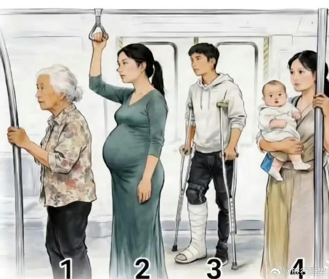 如果坐公共交通,当你遇到图片中情况,你认为优先给谁让座最为合理呢?