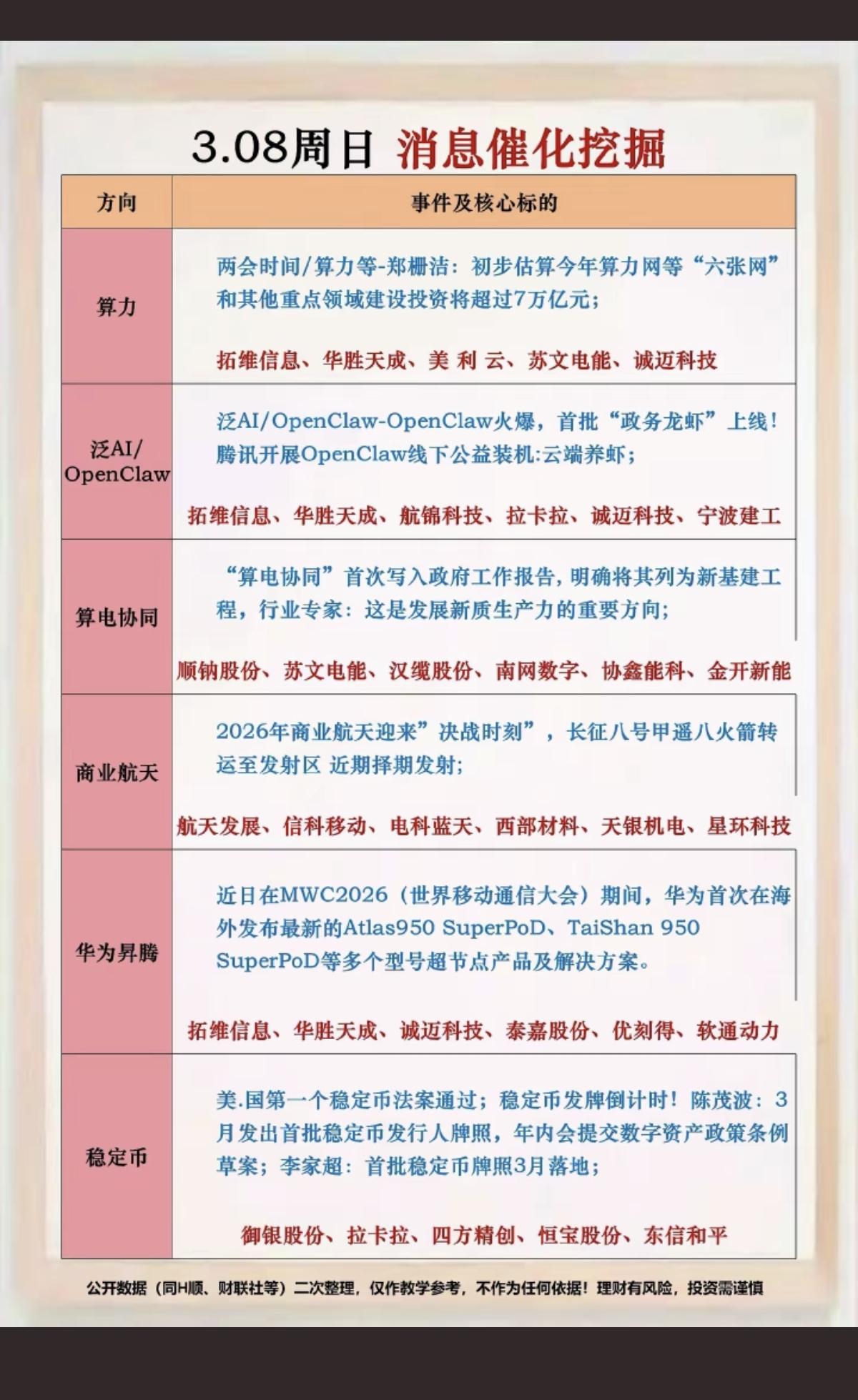 3.8周末 市场热点催化+投资方向! 1.算力硬件 2.泛AI+OpenClaw龙虾模型 3.算电协同 4.商业航天 5.华为昇腾 6.稳定币,数字货币
