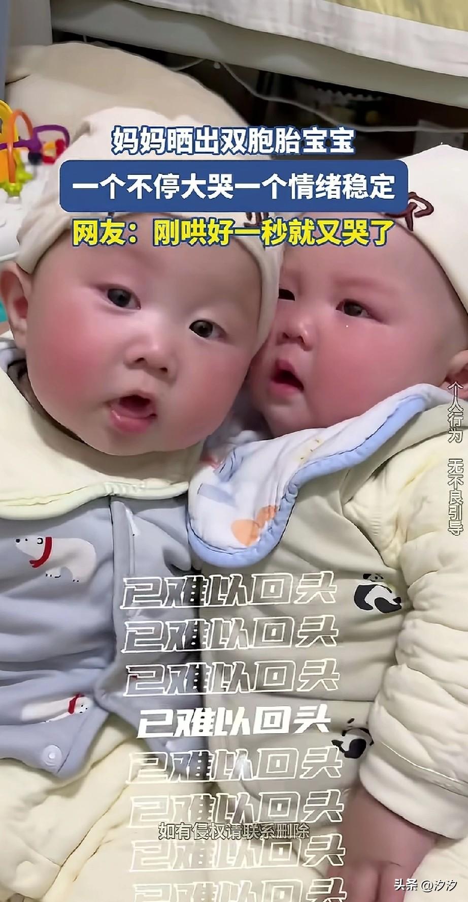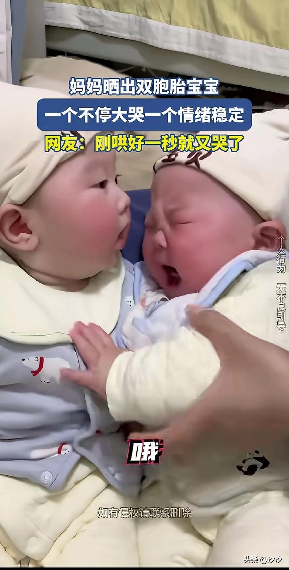 女子生了一对双胞胎, 没想到两个双胞胎, 性格却不一样。 一个一直哭不停, 一个宝宝非常安静, 安静的宝宝,看着爱哭的宝宝, 随后用自己的脸贴了过去, 爱哭的宝宝瞬间就不哭, 不过看到妈妈一眼,又开始大哭起来, 这俩双胞胎挺逗的, 为啥双胞胎性格差别这么大?