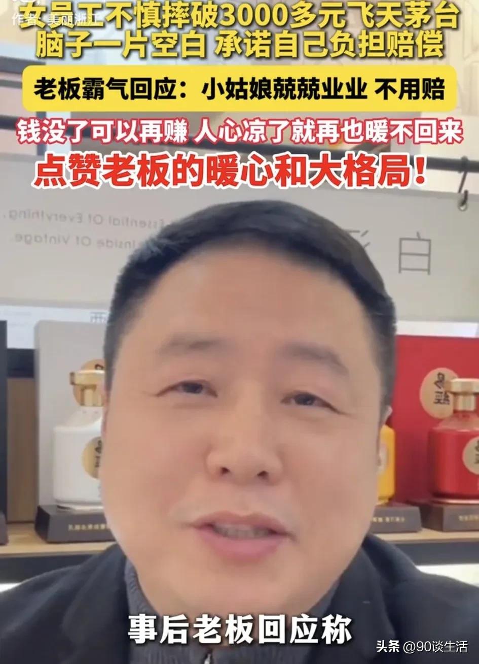 这格局打开了!浙江义乌,一家酒水专营店里,女员工正在收拾酒水,不小心摔破一瓶价值3000多元的飞天茅台。这下女员工懵了,脑子一片空白,暗说这下得自己掏腰包赔偿了,只好拿起拖把把地上的破酒瓶和酒水清理干净。没想到,等老板到店查看视频后,说:不用赔偿了! 网友看到这段视频后,就女员工的行为引发很大的争议和关注。有人说,这就是员工个人的粗心大意,是员工的责任,就该它赔偿,花钱买个教训了。也有人说,这是在给老板打工,即使除了错也不该员工一个人承担,你看那个整理酒水的台面,太窄了,一个打工的一个月才多少钱,如果真的赔了,恐怕这个员工也可能不干了,离职了吧。 正当网友吵得热火翻天时,酒店老板直接一句:“不用赔了!”小姑娘在店里面干了挺久了,工作上也没有出现过什么差错,发生这件事情是意外,谁都没有想到的。也就3000多元,可以挣回来的,要是真的要这个小姑娘赔偿的话,也太寒人心了,人心散了,就再也拾不起来了。 网友说:这老板真大气!老板的善良和格局赢得了网友的点赞和认可,这样的老板不发财都很难呀! 不得不说,老板的做法让女员工挺暖心的,这样的老板谁人不想要,这是老板对员工的认可和赞同。话说,这份温暖是双向的,不能因一次错误就否认她曾经的贡献,你把员工当成家人,员工才会把你当成家人。 总之,被这一幕给深深暖心窝子了!