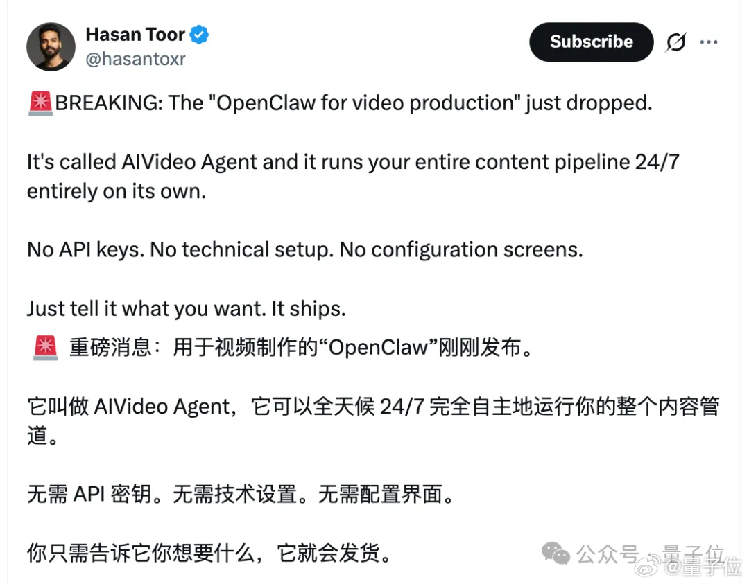 X上有网友分享了一个用于视频制作的“Open Claw”,名叫AIVideo Agent,打开了龙虾的新玩法。