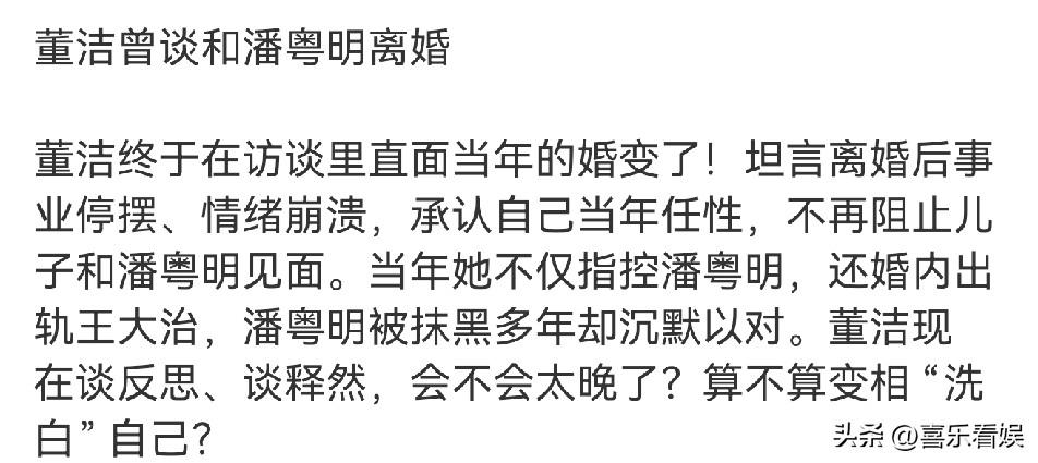董洁潘粤明,同时上热搜! 3月8日,离婚了十多年,也互不往来十多年的潘粤明和董洁,罕见同时冲上了热搜,引起了不少的讨论。 两人这次上热搜,原因是董洁在最新接受的采访中,谈到了当年与前夫潘粤明的婚变。 董洁表示,当年与潘粤明离婚后,情绪很崩溃,事业也停滞了。 如今已经46岁的董洁,再回看当年的自己,她坦言称自己当年“太任性了”,很后悔不让儿子顶顶见爸爸潘粤明。 她表示,现在的自己已经“放下”了,往后也不会再阻止潘粤明见儿子了。 众所周知,当年董洁和潘粤明离婚时,董洁这边指控潘粤明“嗜赌成性、有家暴,还负债”。 一时间,潘粤明就遭到了全网的“谩骂”,他的形象也一下子跌至谷底,以至于事业也都到了严重的影响。 后来,董洁被曝“婚内出轨”,与王大治的亲吻画面曝光。 之后,董洁指控潘粤明的种种形象被证实是不实,大家才知道骂错了人。 如今,董洁的一句“当年太任性”,网友也不再买账了。