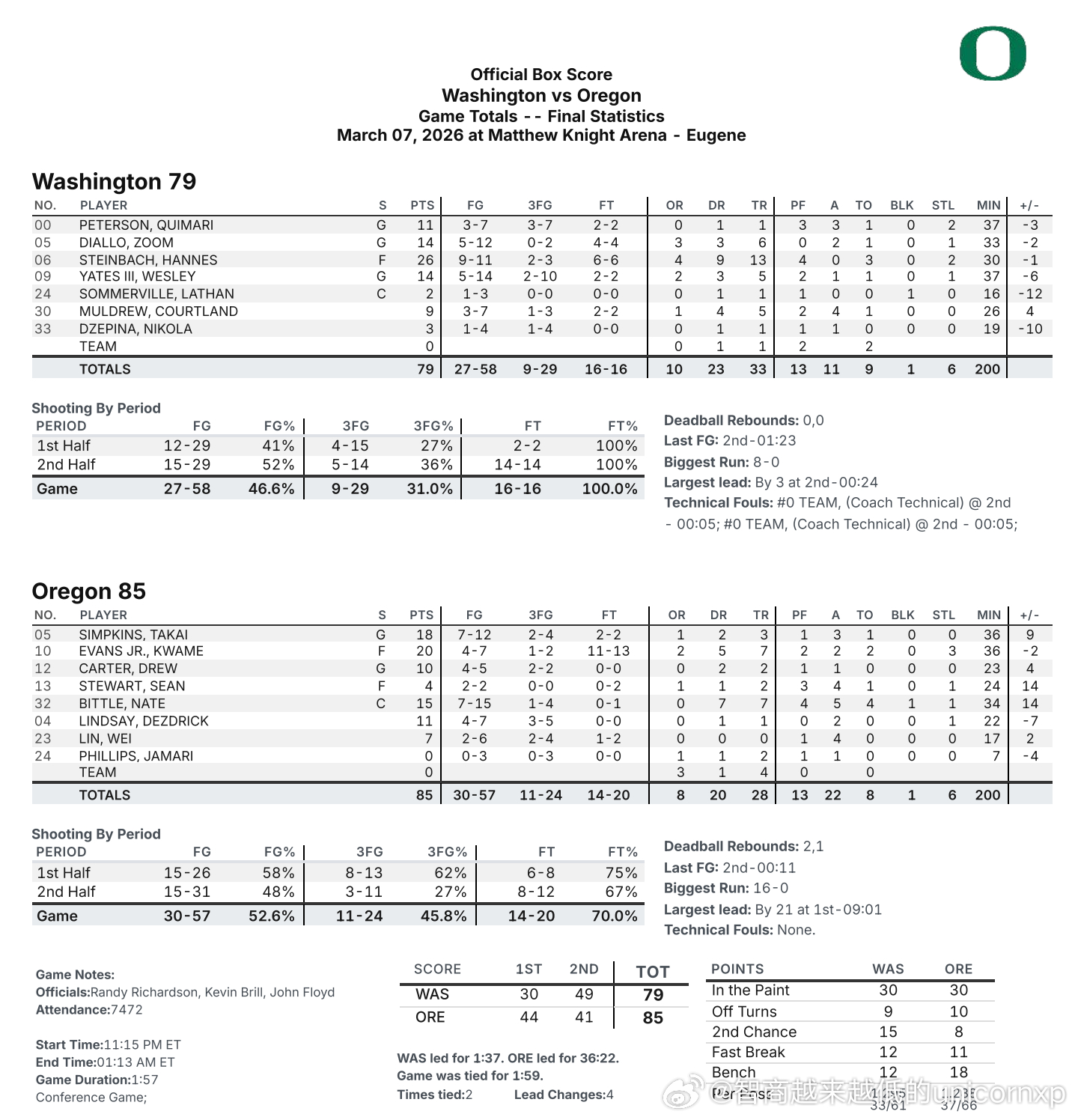 俄勒冈85比79击败华盛顿,林葳出场17分钟得到7分4助,Hannes Steinbach得到26分13板NCAA林葳