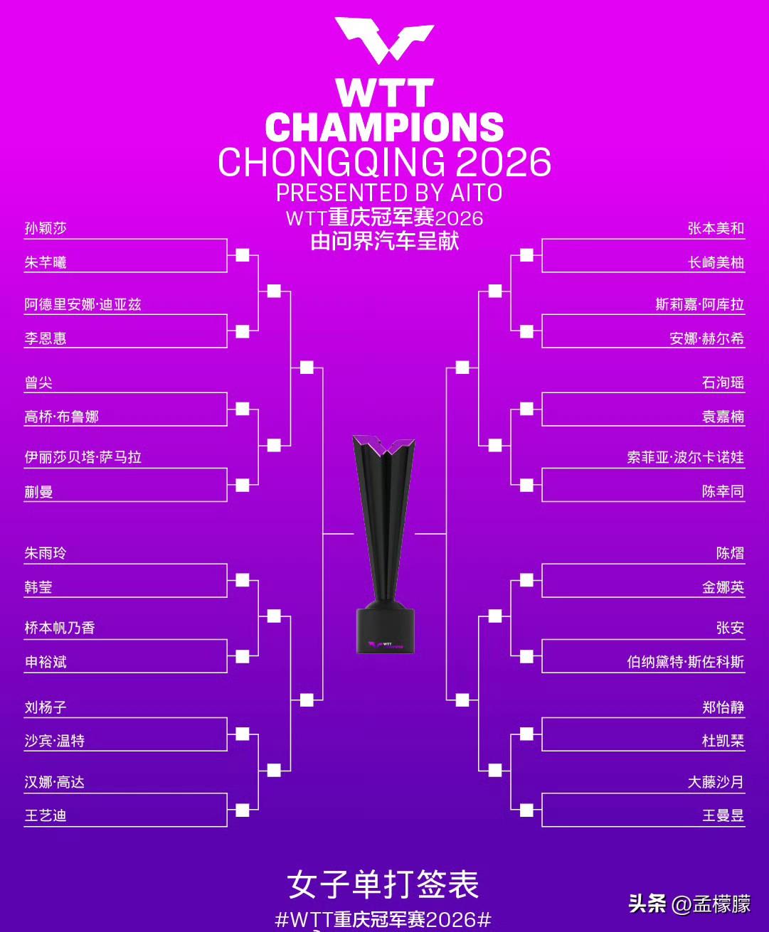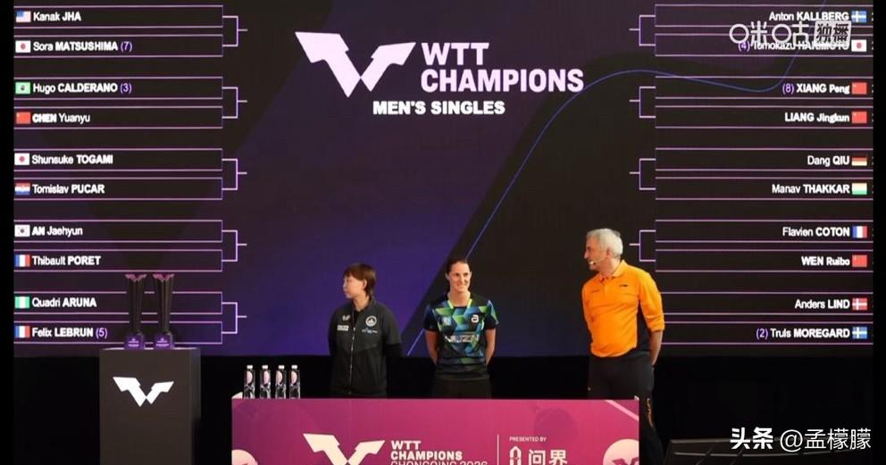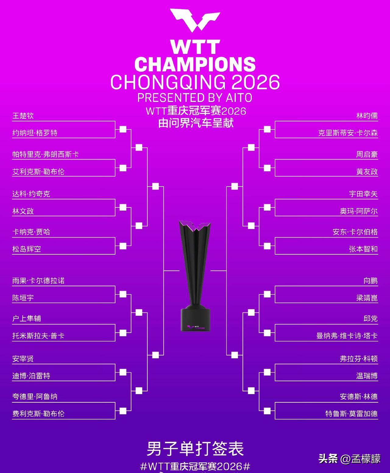 WTT冠军赛重庆站2026丨男单签表,国乒下下签,下半区首轮二场国乒内战 【1/8区】王楚钦🇨🇳VS约纳坦·格罗特🇩🇰、帕特里克·弗朗西斯卡🇩🇪VS艾利克斯·勒布伦🇫🇷 【2/8区】达科·约奇克🇸🇮VS林文政🇦🇺、卡纳克·贾哈🇺🇸VS松岛辉空🇯🇵 【3/8区】雨果·卡尔德拉诺🇧🇷VS陈垣宇🇨🇳、户上隼辅🇯🇵VS托米斯拉夫·普卡🇭🇷 【4/8区】安宰贤🇰🇷VS迪博·泊雷特🇫🇷、夸德里·阿鲁纳🇳🇬VS费利克斯·勒布伦🇫🇷 【5/8区】林昀儒(中国台北)VS克里斯蒂安·卡尔森🇸🇪、周启豪🇨🇳VS黄友政🇨🇳 【6/8区】宇田幸矢🇯🇵VS奥玛·阿萨尔🇪🇬、安东·卡尔伯格🇸🇪VS张本智和🇯🇵 【7/8区】向鹏🇨🇳VS梁靖崑🇨🇳、邱党🇩🇪VS曼纳弗·维卡诗·塔卡🇮🇳 【8/8区】弗拉维安·科顿🇫🇷VS温瑞博🇨🇳、安德斯·林德🇩🇰VS特鲁斯·莫雷加德🇸🇪 乒乓球 WTT重庆冠军赛 重庆冠军赛