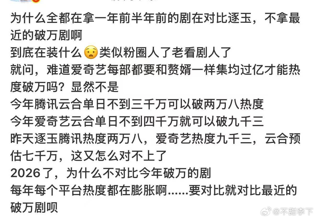 既然都老看剧人了那现在是说云合对不上吗,云合本来就是第三方平台根据热度拟数据当个参考值的,它根据平台28500和9300开出来七千万很正常,但是不正常的是逐玉其他数据对得上它现在次日播放量七千万,热播期集均过亿的走势吗?